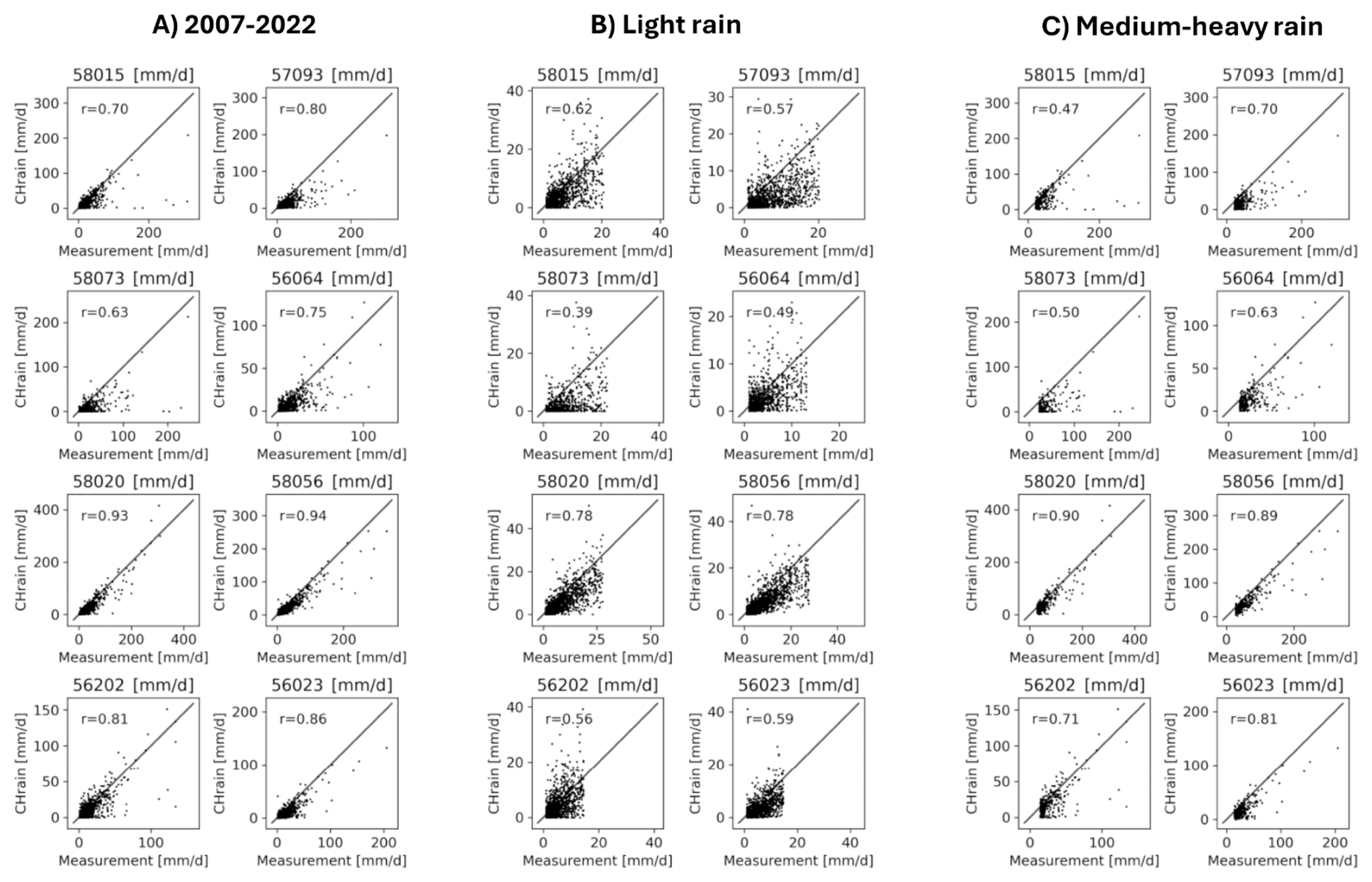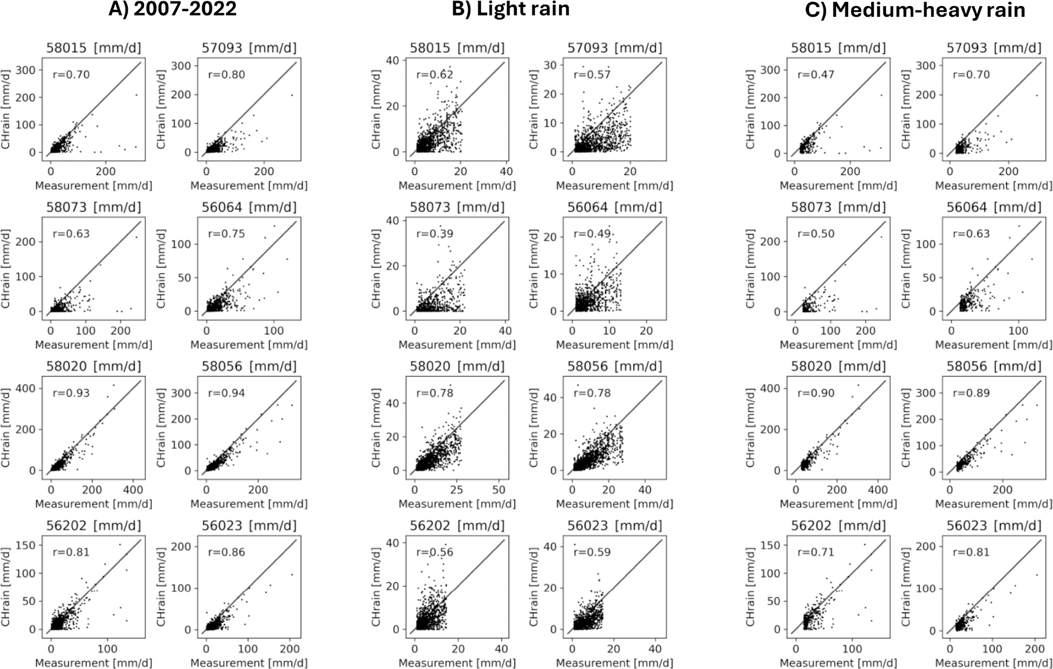 Figure 4Comparison between 24 h total CHRain and daily point measurements at 8 daily rainfall stations for the whole period from 2007–2022 (A). (B) shows the relationship between the two datasets in light rain days, and (C) show the relationship in medium to heavy rain days. r is the correlation coefficient between the two datasets.