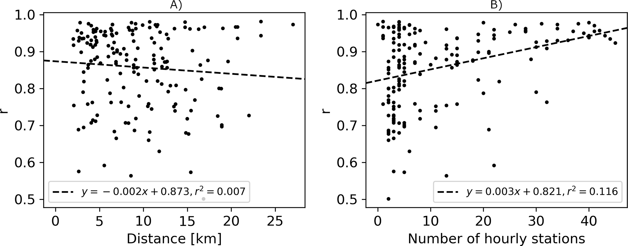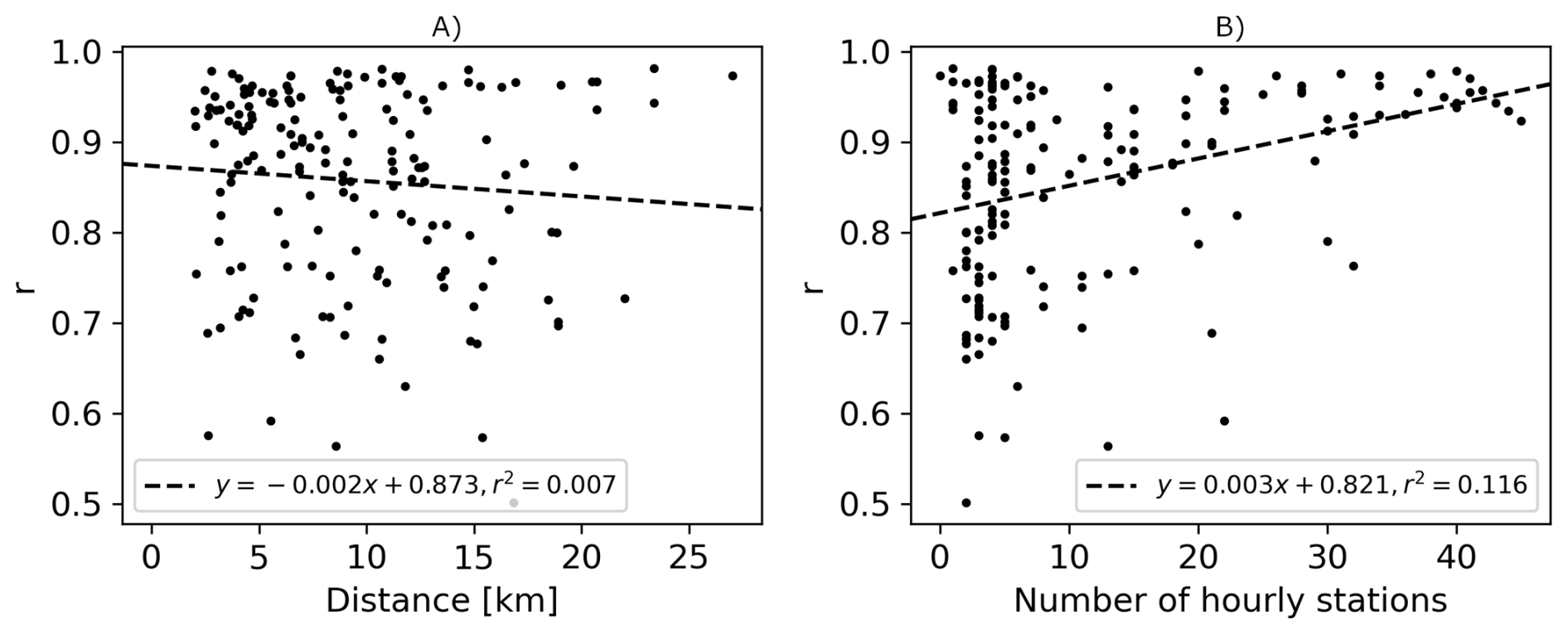 Figure 5(A) Relationships between the correlation coefficients (r) of the 24 h total CHRain and the distance to the nearest input hourly gauge, and (B) the correlation coefficients (r) of the 24 h total CHRain as a function of the hourly gauges density (number of hourly gauges within 25 km radius from a daily station).
