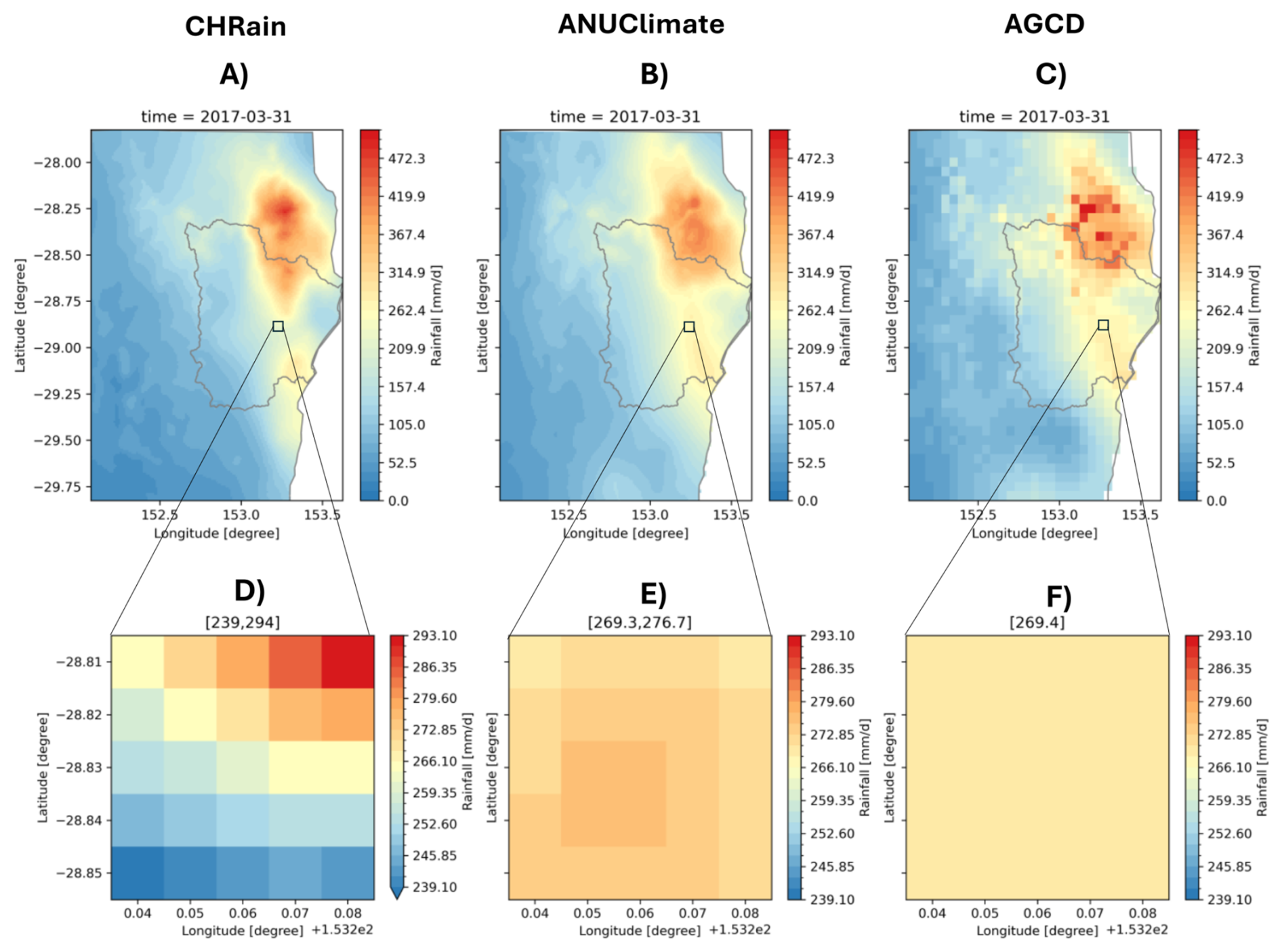 Figure 6Comparison between CHRain, ANUClimate and AGCD datasets on 31 March 2017. (A–C) show the rainfall surfaces from three datasets for the whole study area. (D–F) show the 5 km areas at the hourly gauge 58214.