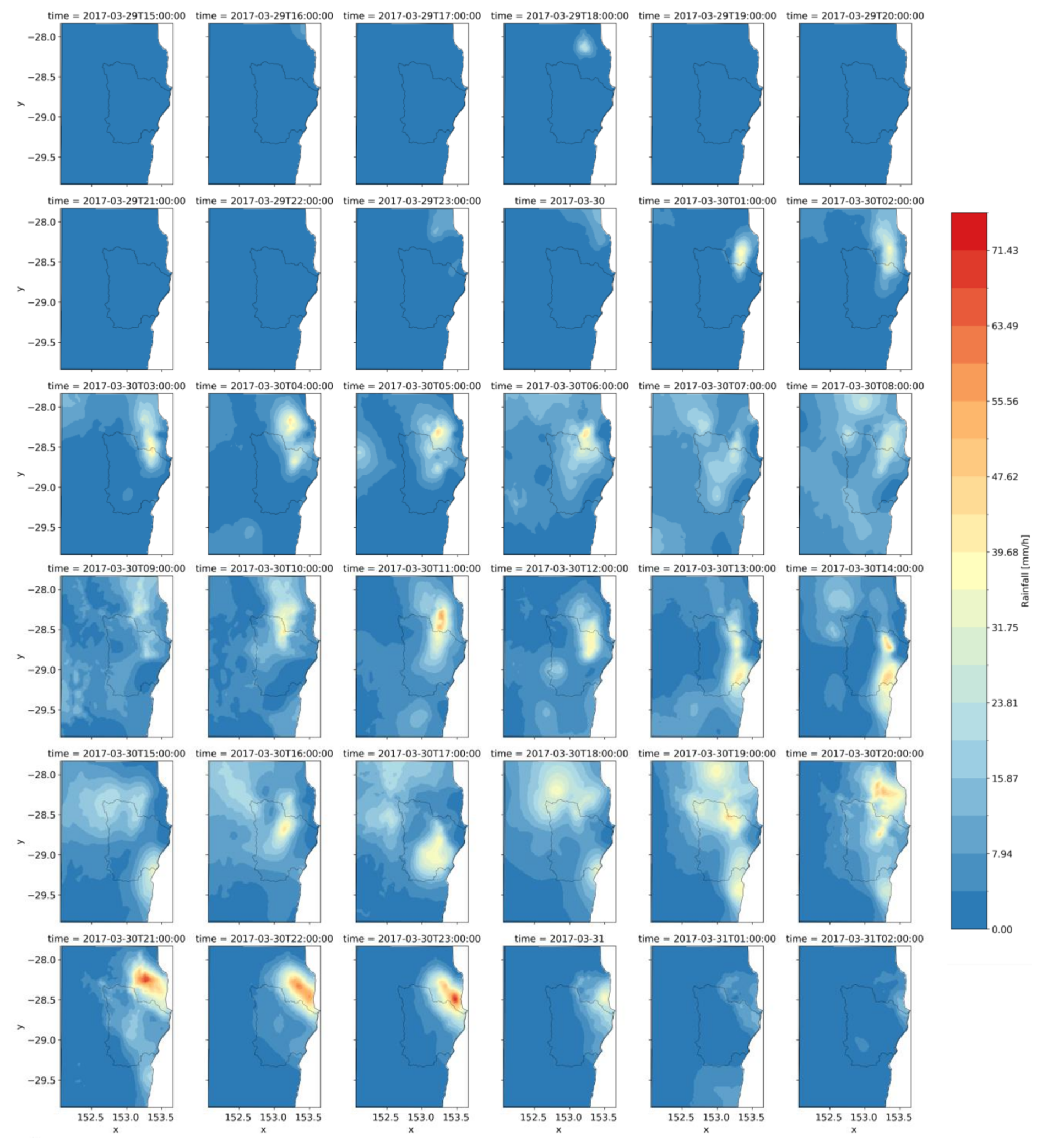 The radar data were provided by the BoM, showing the rain front movement and rainfall intensity over the catchment area (image every 5 min). The radar intensity data were used to generate Radar-derived rainfall accumulation, showing the amount of rainfall accumulating in 1 h (Bureau of Meteorology, 2023). We acknowledge that the radar rainfall shows the rainfall in the atmosphere instead of the rainfall reaching the ground. There are errors in the radar-derived rainfall data, showing unreasonable high rainfall values in some areas (Bureau of Meteorology, 2023). The radar data were employed to observe and understand the movement and distribution of rainfall front in the study area. The hourly rainfall accumulating from radar data were not used in our analysis. The radar images in the Richmond River catchment were available from 2 December 2013.