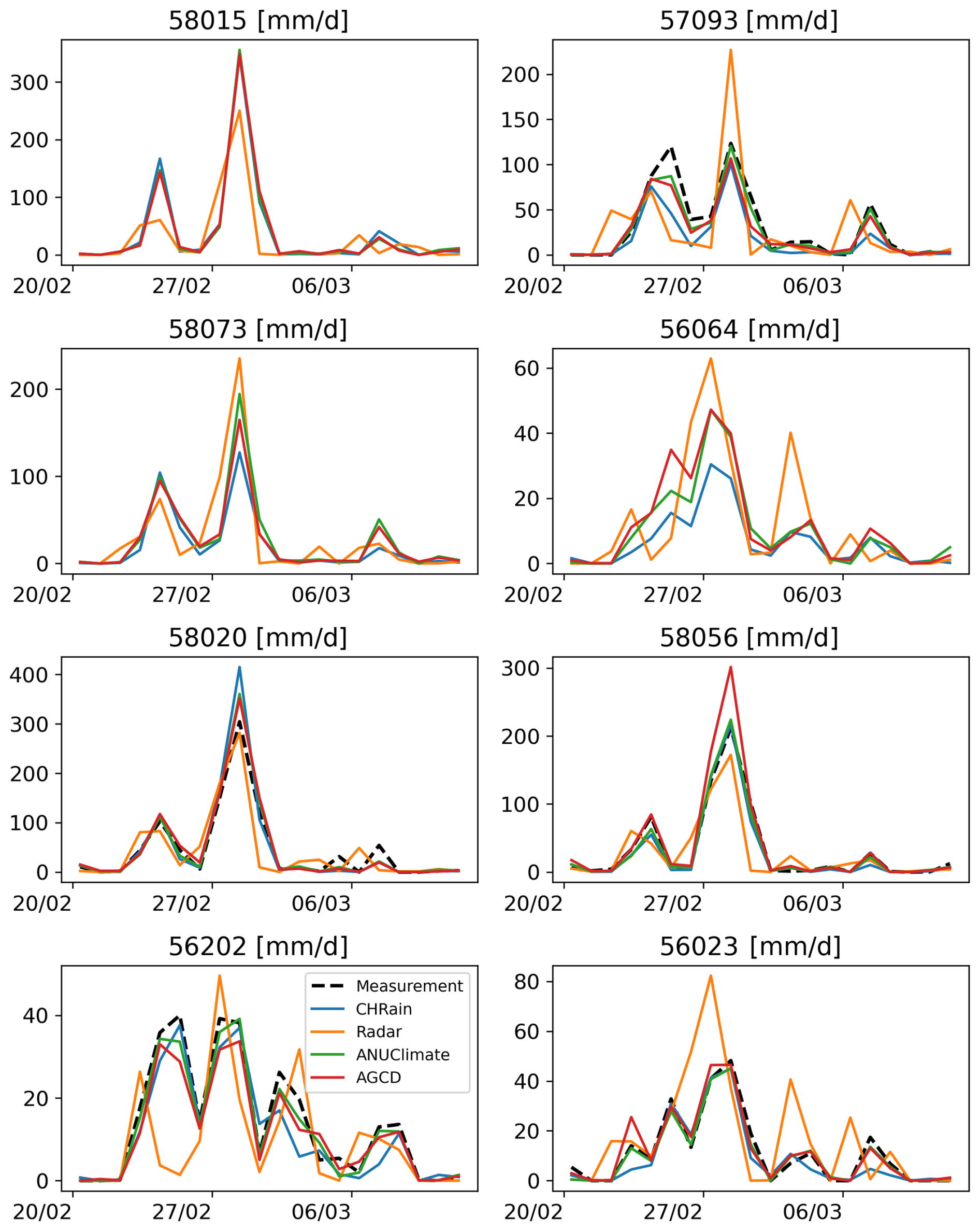 We also conducted a comparison of the 24 h total CHRain performance with the daily measurements for the whole period from 2007 to 2022 at 169 daily gauges, which were not included in the generation of CHRain splines. Overall, the CHRain dataset is highly correlated with the daily measurement, indicated by an averaged correlation coefficient of 0.86. Figure 4 compares the relationship between the 24 h total CHRain and the daily measurements at 8 selected daily gauges, during days with light rainfall, and medium to extremely heavy rainfall. The CHRain dataset performs better during periods of medium to very heavy rain compared to days with light rain, except at station 58015. For the Richmond River catchment, the light rain events usually occur at a small scale. A slight difference in the locations where rainfall values are extracted from the 24 h total CHRain splines and the exact locations of daily rainfall gauges can lead to significant variations between the two datasets during light rain periods.