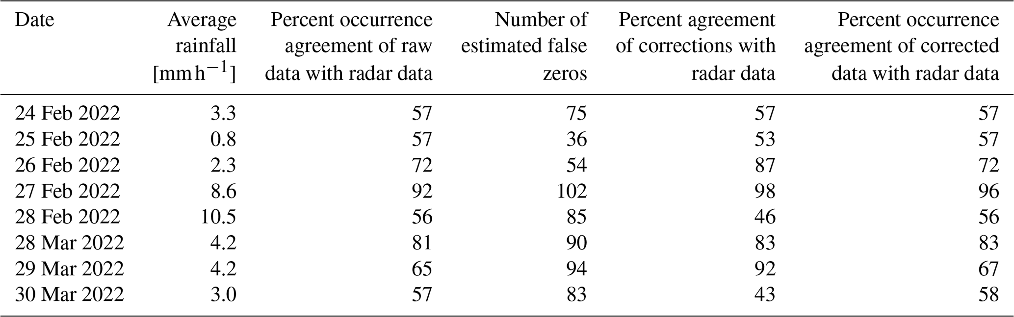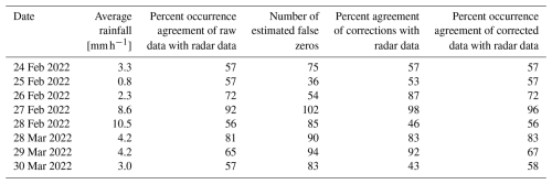 Table 2Summary statistics of occurrence corrections with respect to hourly radar data over five successive days, during the two flood events in 2022. Occurrence agreement is calculated as the percentage of the number of agreements in occurrence (both zero or both non-zero) divided by the total number of hourly data values.