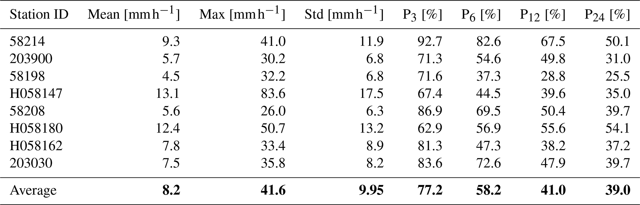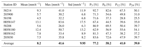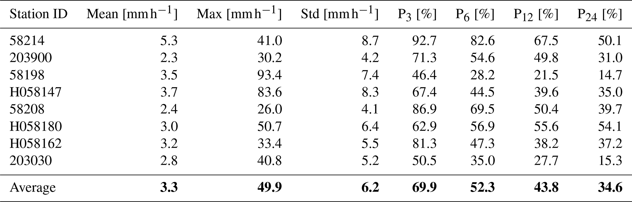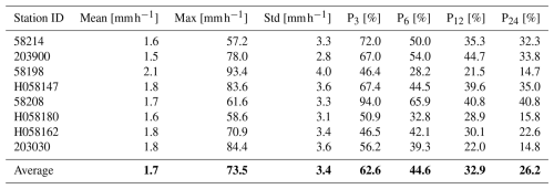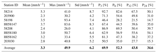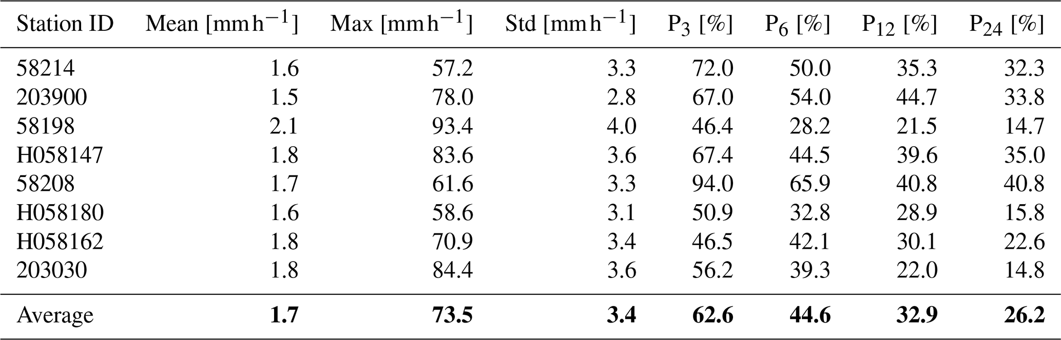Table 3Statistics for the observed hourly rainfall from 2007 to 2022. The average values of the statistics are shown in bold.