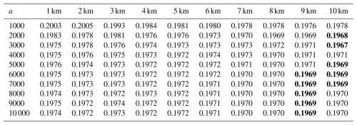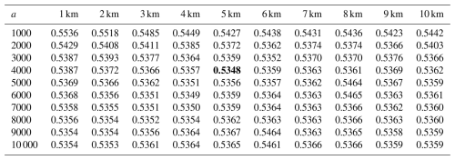 Table 4Performance of the interpolation model with different elevation transformation parameters and elevation smoothing scales for light rain days (0–1 mm h−1). The minimum values of the RTGCV are shown in bold.