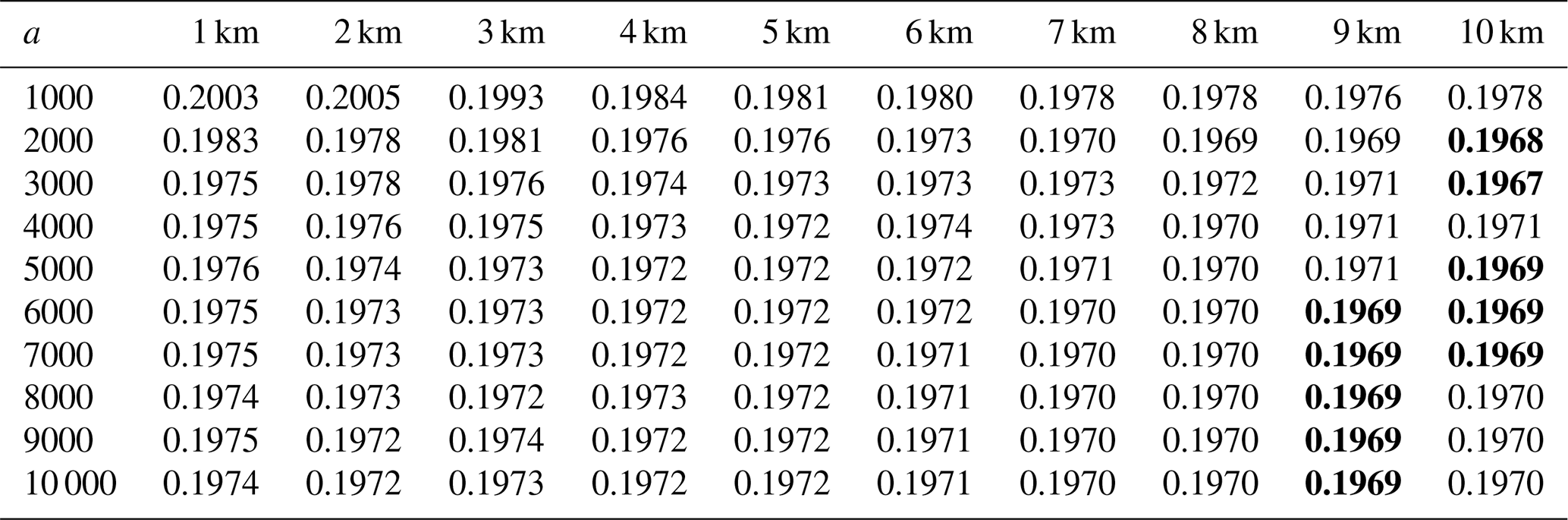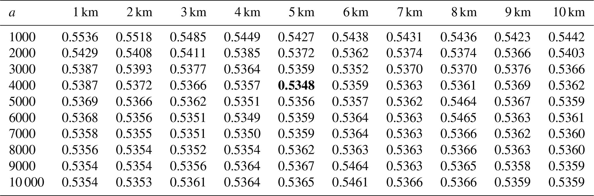 The days of hourly rainfall data were categorised into two groups to analyse the impact of topography on spatial rainfall patterns. Days with average hourly rainfall between 0 and 1 mm h−1 were considered as light rain days, and days with average hourly rainfall exceeding 1 mm h−1 were considered medium to high rainfall days. There were 3379 light rainfall days and 111 medium to high rainfall days. There were 246 d with zero rainfall across the whole data network. These days were omitted from the calibration. The focal mean distance and the elevation scaling parameter a were jointly optimised to minimise the average of the generalised cross validation of the fitted splines over all medium to high rainfall days.