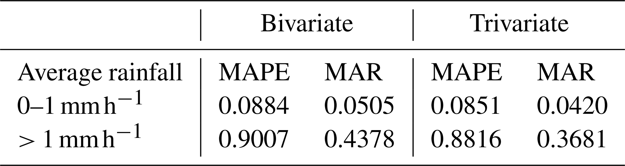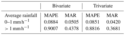 The impact of including the DEM as an independent variable was further quantified in Table 6. It shows that, compared to the bivariate analysis, the optimal trivariate analysis reduced the MAPE by about 4 % for light rainfall days and by about 2 % for medium to heavy rainfall days. The trivariate analysis reduced the MAR by about 16 % across all days.