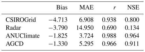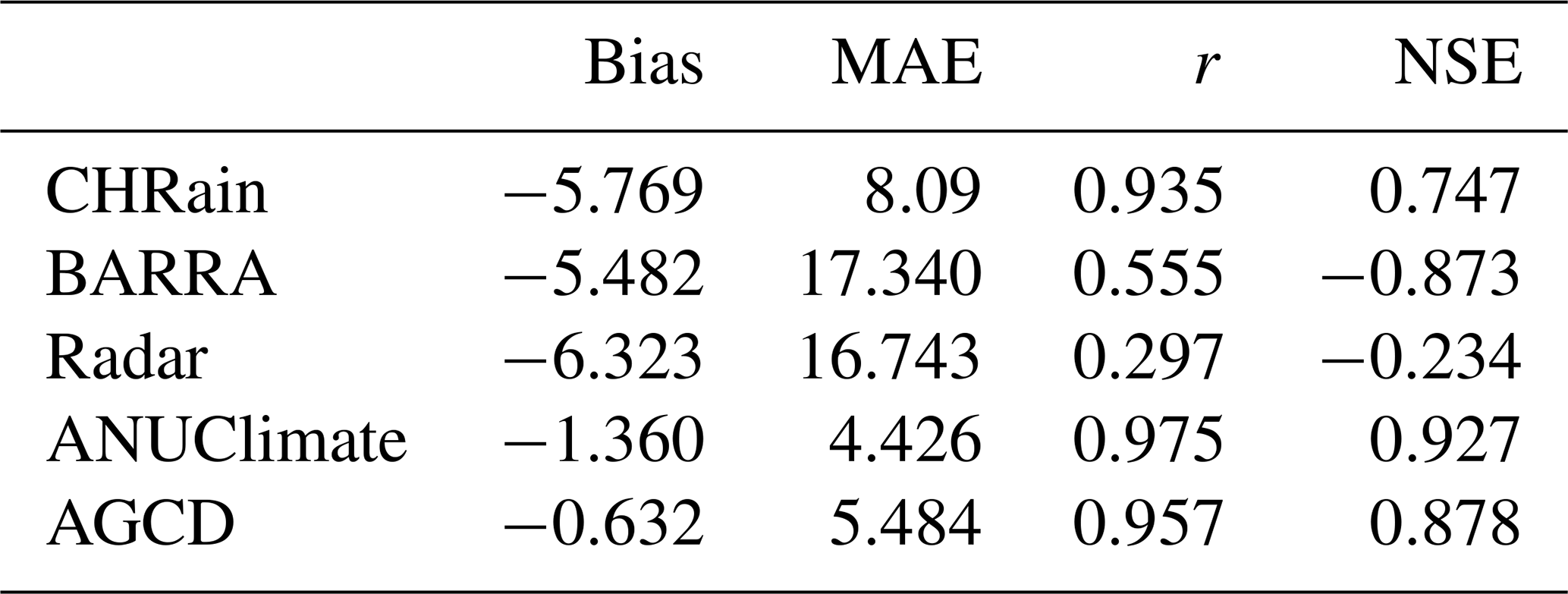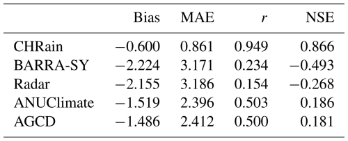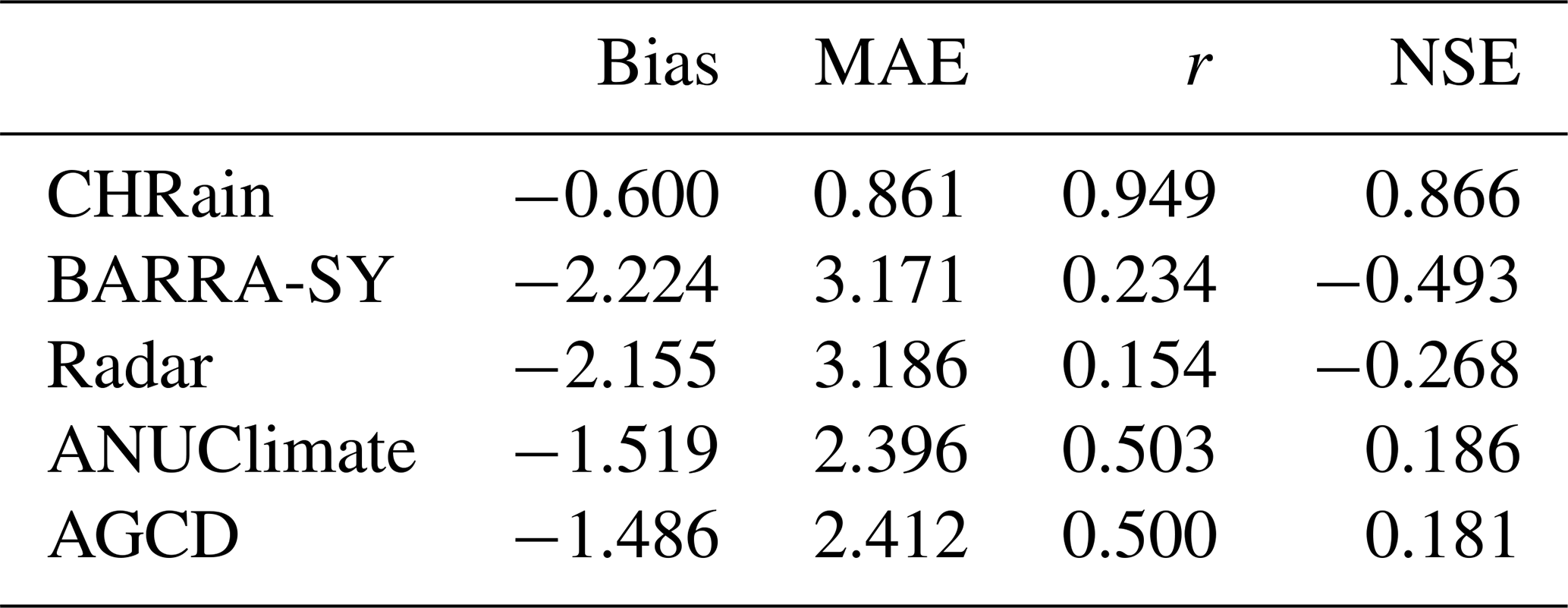 The hourly 1.5 km resolution BARRA-SY dataset was compared with our hourly CHRain product. The BARRA-SY dataset is available from 1 January 1990 to 28 February 2019 and covers a domain with the latitude range [−28°, −38°] and the longitude range [147°, 155°]. The ANUClimate version 2 dataset (Hutchinson et al., 2021) provides gridded daily rainfall data at 0.01° resolution (approximately 1 km) from 1 January 1900. These grids have been generated using the thin-plate spline method to interpolate daily point measurements, considering the impacts of topography (Hutchinson et al., 2021; Johnson et al., 2016). The AGCD dataset contains daily 0.05° resolution (approximately 5 km) rainfall surfaces from 1 January 1900. The AGCD dataset covers the whole of Australia and is regularly updated with real-time data. The BARRA-SY, ANUClimate, and AGCG data are available from the National Computational Infrastructure Data Catalogue (https://geonetwork.nci.org.au/geonetwork/srv/eng/catalog.s earch#/home, last access: 30 December 2025).