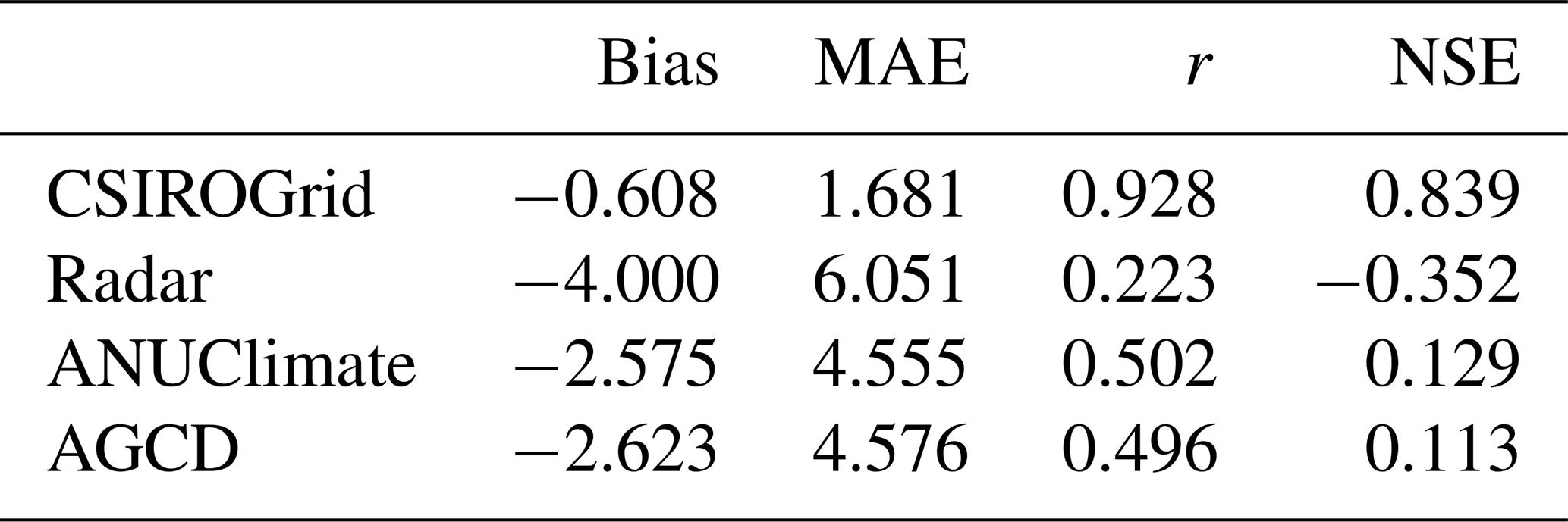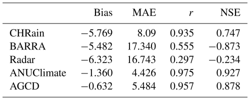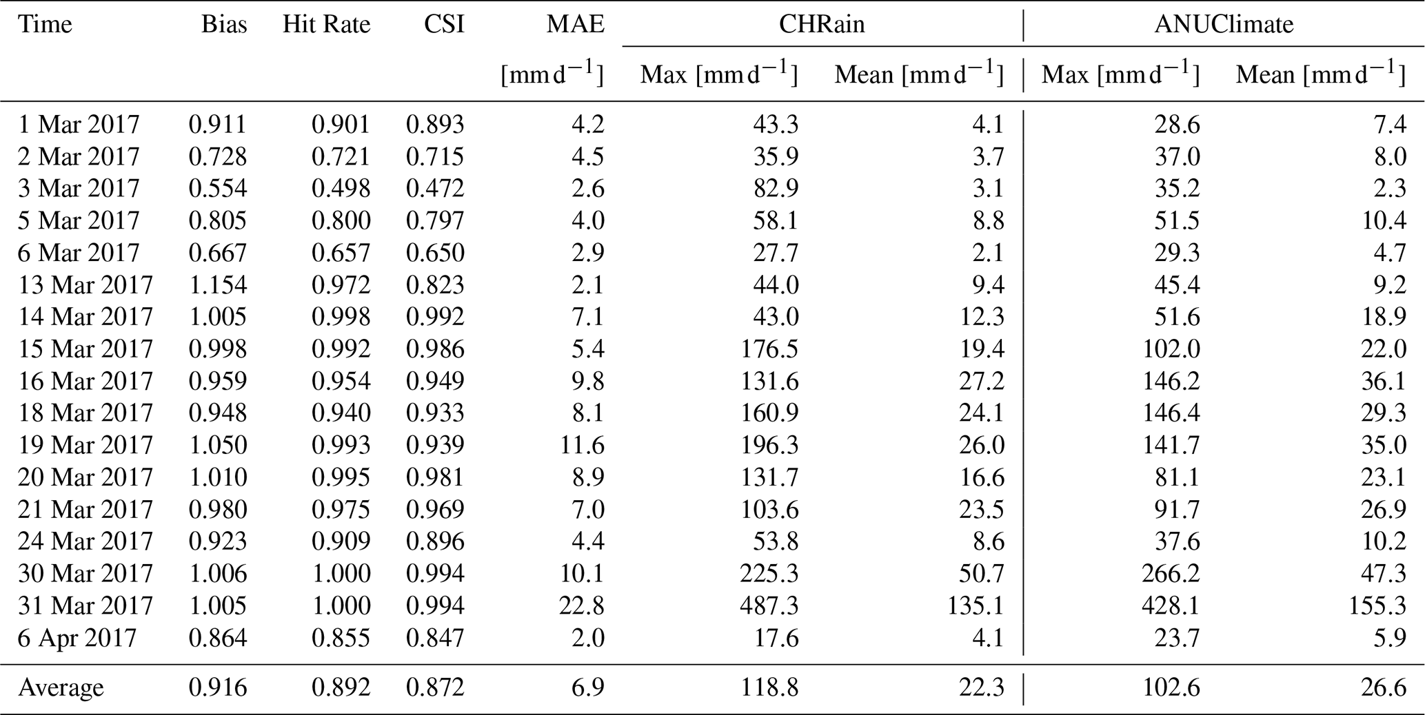 The Bias, Hit Rate, and the Critical Success Index (CSI) (Ebert, 2008) were used to compare the 24 h total CHRain with the ANUClimate. The optimal value for the Hit Rate and CSI is 1, showing a perfect match between the two datasets. The Bias value describes the difference between the generated grid and the observed data. The Hit Rate shows the proportion of wet pixels in the generated dataset that are correctly predicted. The CSI considers both the underestimation and overestimation of the generated dataset.