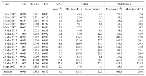 From the temporal analysis in Sect. 3.3, the ANUClimate dataset gives the best match to the daily measurements. In this spatial analysis, we compared the splines from 1 km CHRain dataset to the 1 km ANUClimate and 5 km AGCD datasets. Table 9 shows the comparison between the 24 h total CHRain dataset and the ANUClimate dataset during the 2017 flood event, for the days with heavy rainfall (i.e., the maximum rainfall value in a grid is higher than the 95th percentile).