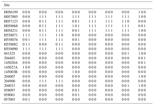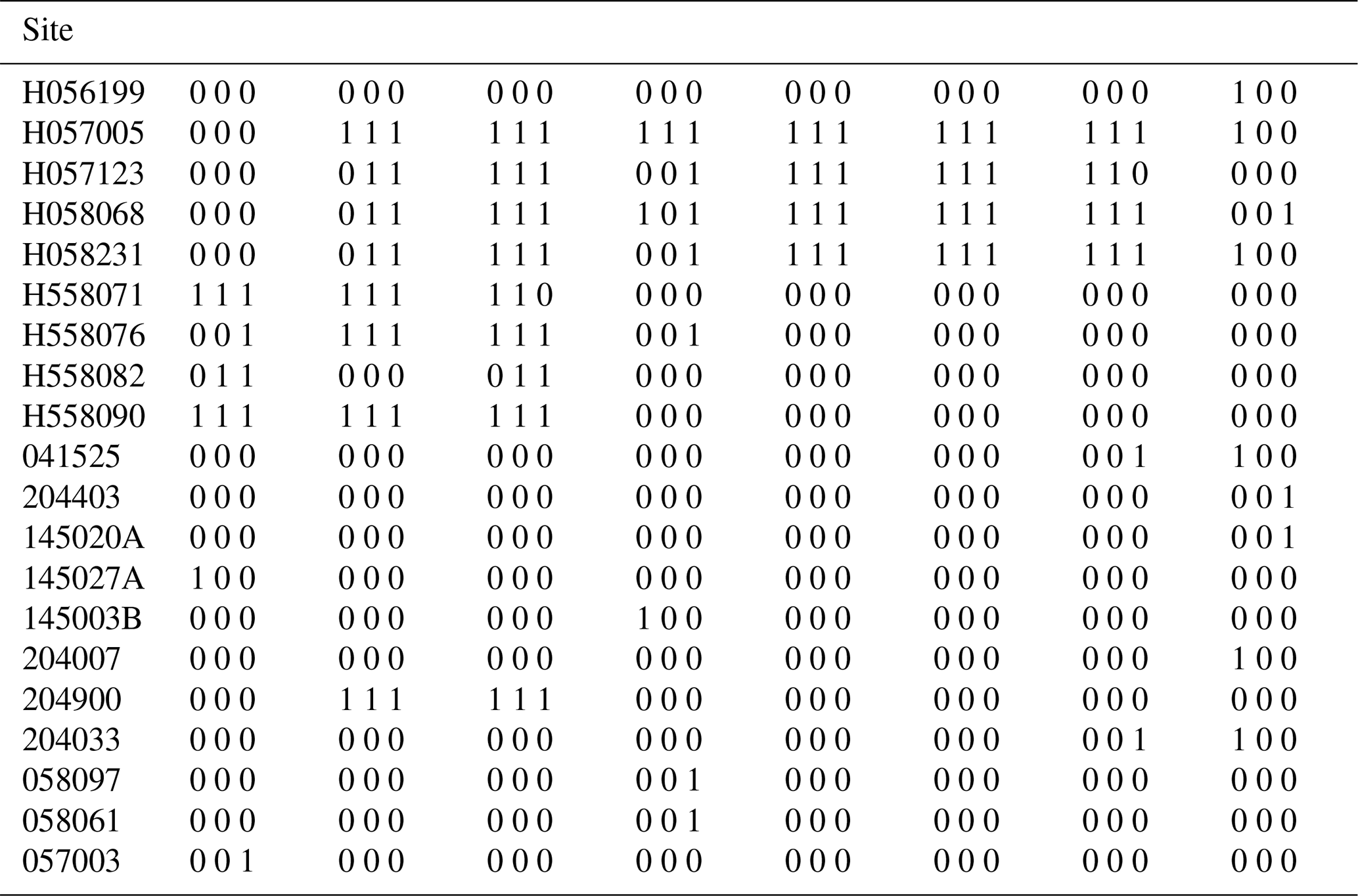 The 1's in Table B1 denote the false zerosas determined by the spline occurrence analysis, over the 24 h for the high rainfall day on 30 March 2017. On this day almost all sites recorded all positive rainfall data values after the first 3 h. Sites H057005, H057123, H058068, H058231 recorded zero values for all 24 h. Sites H558071, H558076, H558090, 204900 recorded zero values for the first 8 or 9 h followed by missing data. Site H558082 had 4 zero values over the first 9 h followed by missing data. All of these false zero detections appear to be correct. The few remaining isolated detections are at sites with positive rainfall values on preceding or succeeding days.