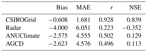 The hourly time series at 8 hourly stations were extracted from the gridded datasets and compared with the point measurements for the 2017 (Table 7) and 2022 flood events (Appendix D). The CHRain dataset outperforms the hourly BARRA-SY and radar datasets in representing the measured rainfall data, as indicated by the high correlation coefficient of 0.949, compared to 0.234 and 0.154 for BARRA-SY and radar datasets, respectively (Table 7). Note that as the hourly data from the 8 stations were used to generate the CHRain dataset, it is expected that the CHRain can adequately match the hourly rainfall patterns from the measurements. However, it is not necessary for the thin-plate spline interpolation model to generate exact values of rainfall at the gauges. The rainfall value of a grid cell is calculated and smoothed in relation to the rainfall values measured at surrounding gauges.