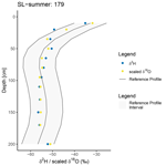 SL reference profiles show variations with depth, indicating the preservation of isotopic seasonality in precipitation. The summer profile (SL-summer) shows higher δ2H and scaled 18O value summer precipitation at the surface (−35 ‰), decreasing with depth to the winter signatures (δ2H and scaled ) in 0.5 m. A slight δ-value increase is visible in 1.2 m, decreasing again to winter signatures (δ2H and scaled ) in 2 m depth. The fall profile (SL-fall) shows a more uniform shape with a low standard deviation of ±2.5 ‰.