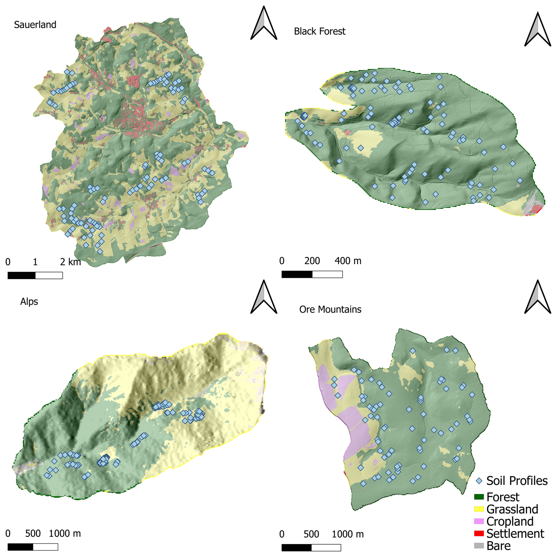 Figure 1The four research catchments with dots representing the locations of the soil water stable isotope profiles: Sauerland (51.3548° N 7.9836° E, Germany; 106 profiles, Abbreviation: SL), Black Forest (47.9262° N 7.8268° E, Germany; 91 profiles, Abbreviation: BF), Alps (47.0023° N 11.4312° E, Austria; 96 profiles, Abbreviation: TA) and Ore Mountains (50.6987° N 13.2304° E, Germany; 86 profiles, Abbreviation: OM).