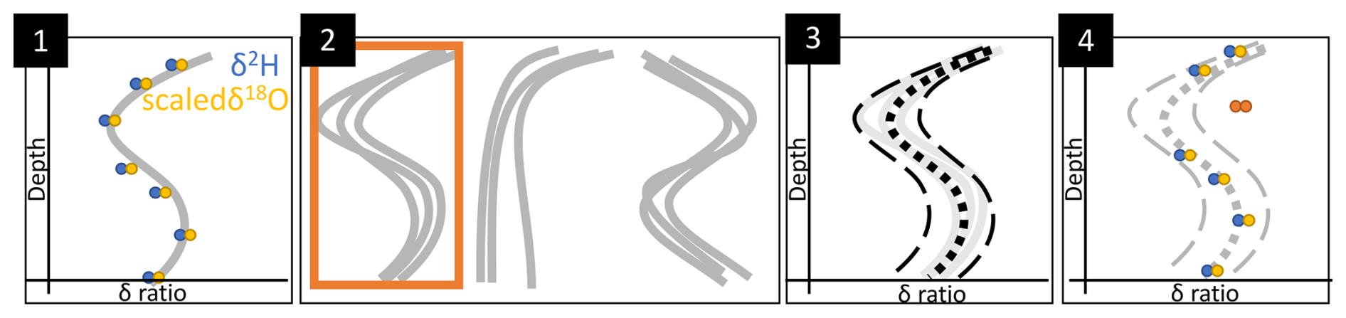 Figure 2Visualization of the methodology: (1) scale δ18O to δ2H value range and fit a polynomial function, (2) cluster the fitted functions of all profiles and select the profile cluster which matches the isotopic seasonality, (3) calculate the mean and two standard deviation for the cluster to define a reference profile, (4) reference each individual profile and identify outliers which correspond to preferential flow.