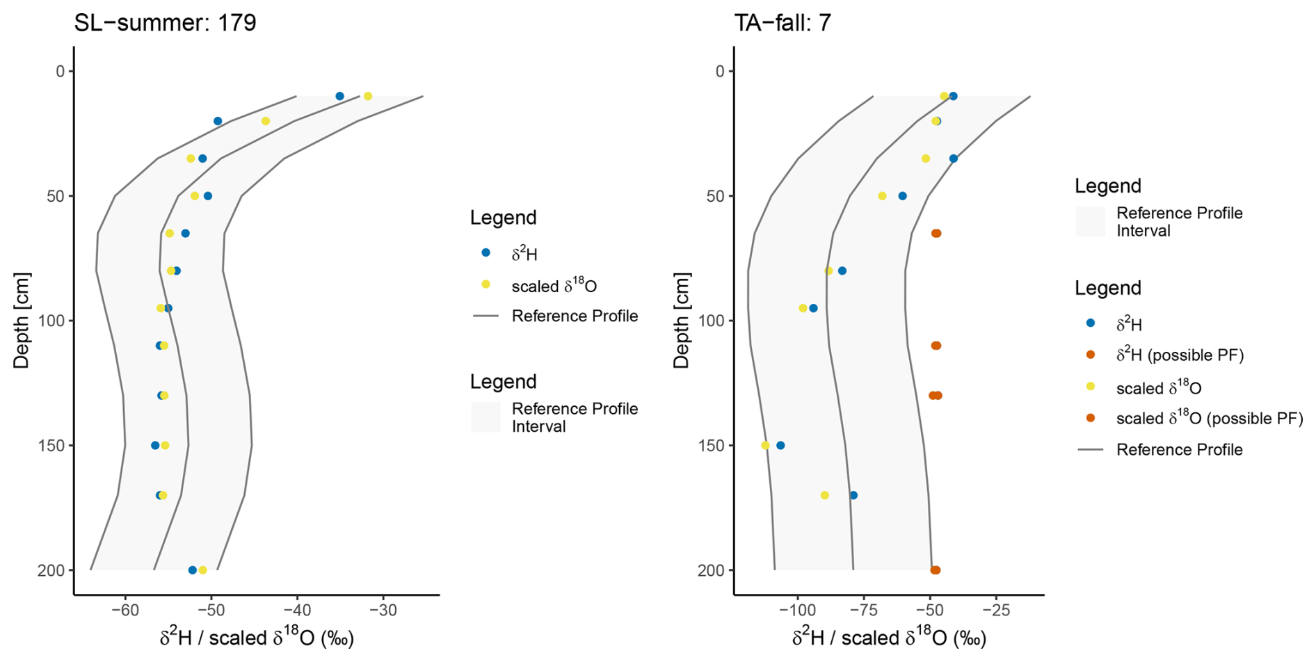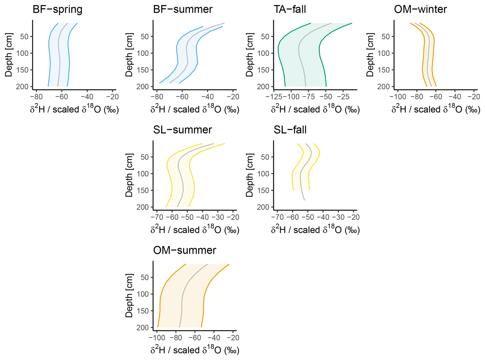 When the reference soil water isotope profiles are compared by season, BF-summer and SL-summer are strikingly similar. Both exhibit a characteristic S-shaped curve and comparable δ-values. OM-summer also shows an S-shaped curve, but with a considerably broader uncertainty band, indicating greater variability. Enriched precipitation signals are clearly visible in the topsoil across all summer profiles, while deeper layers retain more depleted isotopic signatures, likely from the preceding winter. By contrast, the TA-fall profile remains similar to that of summer, with enriched – and potentially evaporation-influenced – signatures persisting in the upper soil. However, the SL-fall profile deviates markedly, displaying more depleted isotopic values even at the surface. This suggests the early infiltration of autumn precipitation.