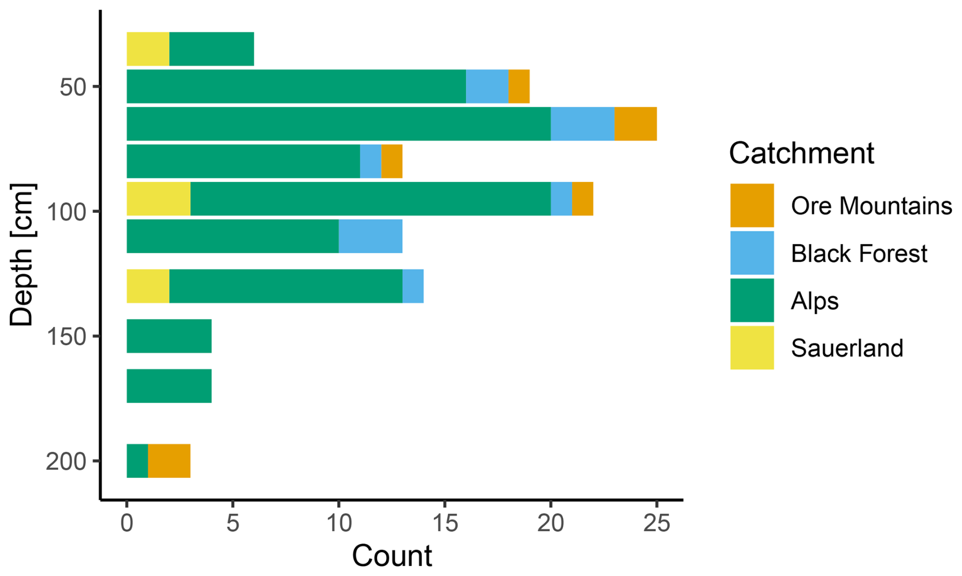 By applying the reference profile thresholds to each individual profile, we identified 63 profiles from the total of 393 that met the preferential flow criteria (Table 1). Most profiles exhibit a shape akin to that depicted in Fig. 4-left, with all measurements laying within the reference profile interval. Figure 4-right shows a example profile with multiple identified preferential flowpaths. Most of the profiles identified for preferential flow (42) were located in the alpine catchment, the remaining equally distributed among the other three catchments. In the Alps, profiles often had multiple depths in which preferential flow was identified (mean: 2.32 depths in each identified profile). Preferential flow was predominantly identified at a depth of 50–65 cm, with a decrease observed at greater depths (Fig. 5). But also below 1 m preferential flow was frequently identified in the profiles.