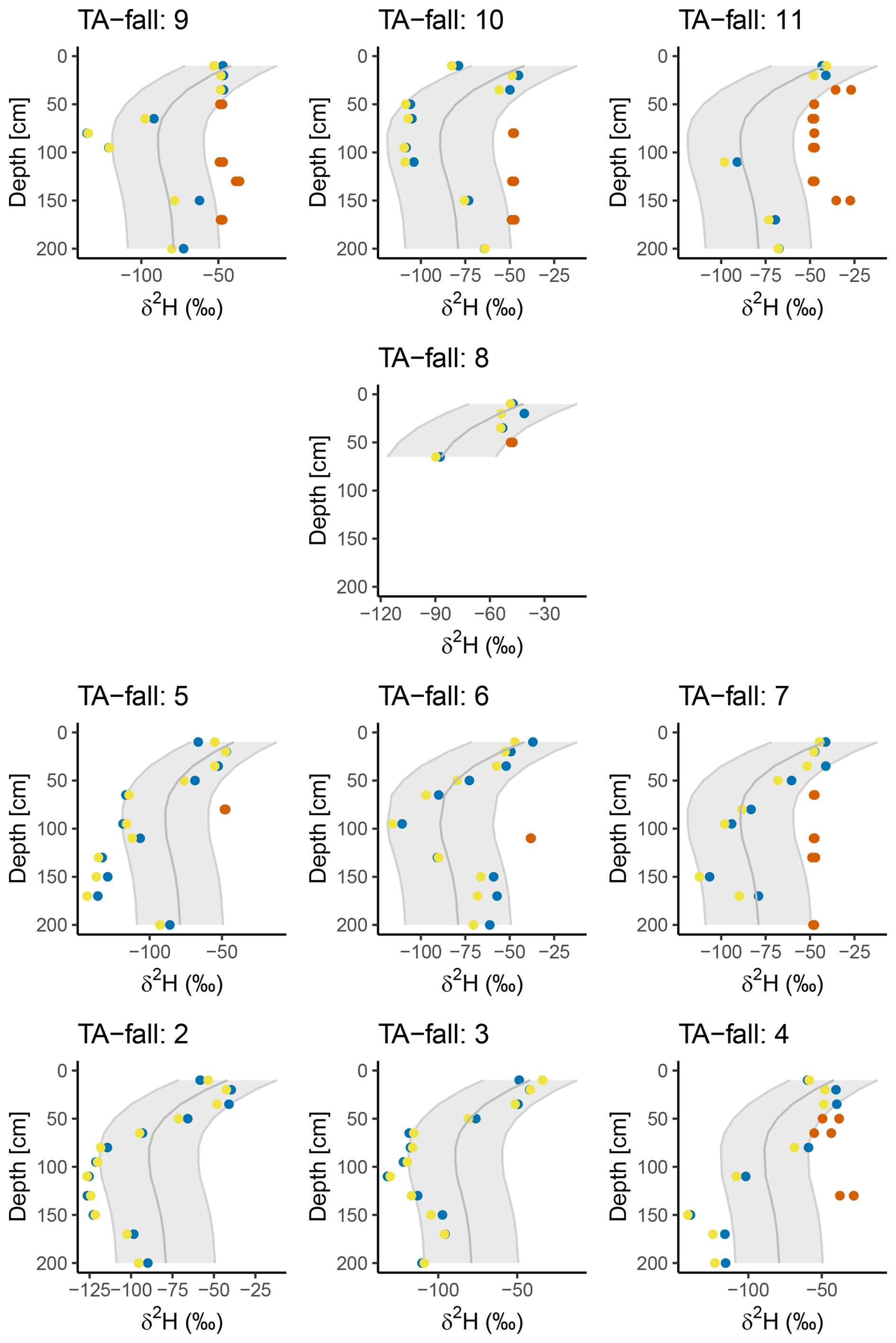 Figure 6Profiles of TA-fall plots 2–11. Unlike most profiles which are scattered throughout the catchments, these profiles are in close vicinity on the same hillslope. The profiles in the lowest row are at the hill-foot and each row above is 10 m upslope of the previous. Profile columns are spaced 5 m apart. Yellow and blue dots show the measured/scaled δ-value in each depth, vermilion dots indicate divergence from the reference profile. The grey line portrays the generated reference profile with a ± two standard deviation band as a preferential flow identification threshold.