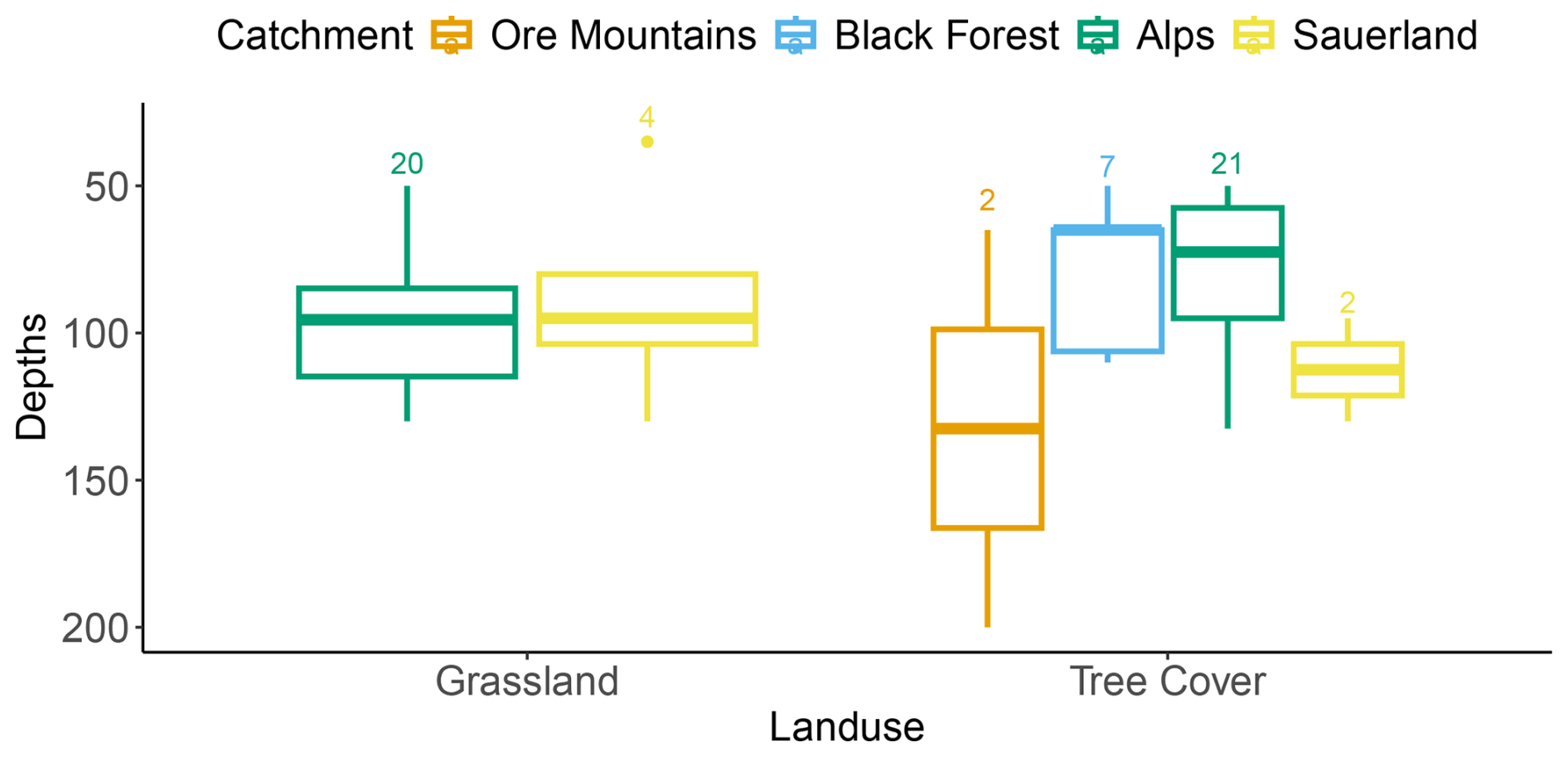 Figure 8Landuse and depth of the identified profiles. Numbers above the boxplots indicate the number of observation in each.