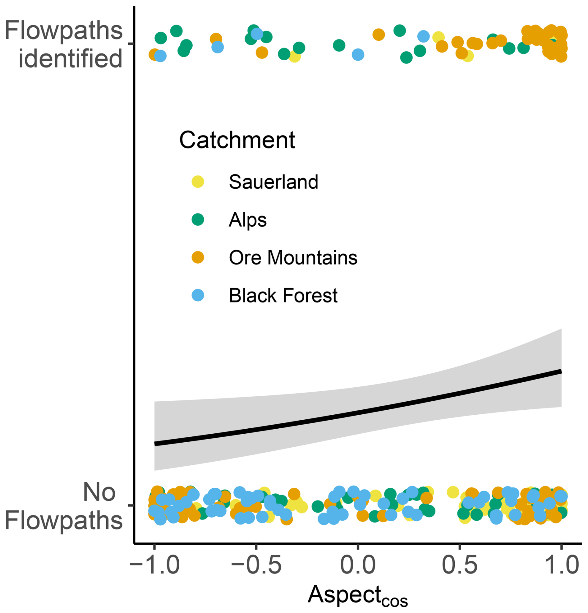 We employed logistic regression analysis to evaluate the impact of various topographic factors on preferential flow (PF) occurrence. Due to the limited number of identified PF profiles, most variables, including catchment, land use, slope and altitude, showed no statistically significant correlations. Of the tested predictors, only the cosine-transformed aspect (Aspectcos; Eq. 2) exhibited a significant relationship (p=0.044). This suggests that north-facing slopes were more likely to exhibit PF features than south-facing ones (Fig. 9c). However, this trend was largely driven by the alpine catchment, where the majority of PF profiles were located on north-facing slopes. When analyzed at the catchment level, the relationship was no longer statistically significant. Furthermore, while the overall trend was significant, the effect size was small, indicating that although PF is more prevalent on north-facing slopes, the majority of soil profiles still show no evidence of preferential flow.
