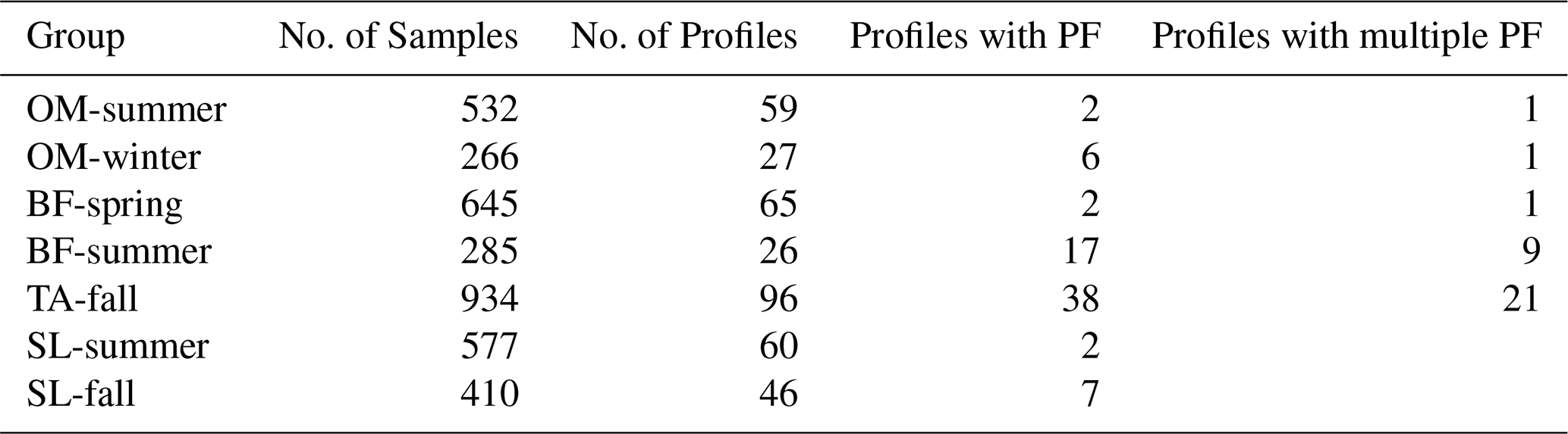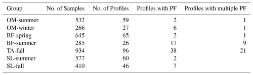 Table 1Summary of profile count with (multiple) preferential flow (PF) indications across Sample Groups.