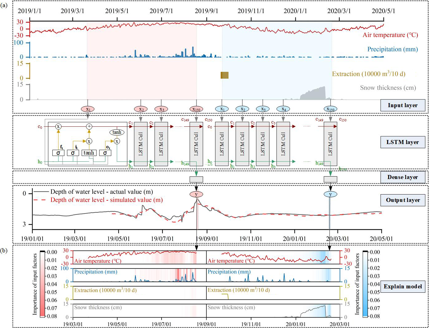 Figure 1 shows the workflow of this study, including three main steps. First, the LSTM model is used to establish a nonlinear relationship between meteorological factors, human activities, and groundwater level depths (Fig. 1a). The daily air temperature, precipitation, extraction volume, and snow depth were used as input variables to predict the groundwater level depths. Subsequently, the EG method (Jiang et al., 2022) was applied to the trained LSTM model to obtain the EG scores of the input factors at different time steps. The EG scores quantify the influence of the meteorological inputs (air temperature, precipitation, and snow depth) and human activities (extraction volume) on the groundwater level depths during the simulation process (Fig. 1b). Finally, the causes of groundwater level dynamics during the non-freeze–thaw and freeze–thaw periods in seasonally frozen soil areas were identified.