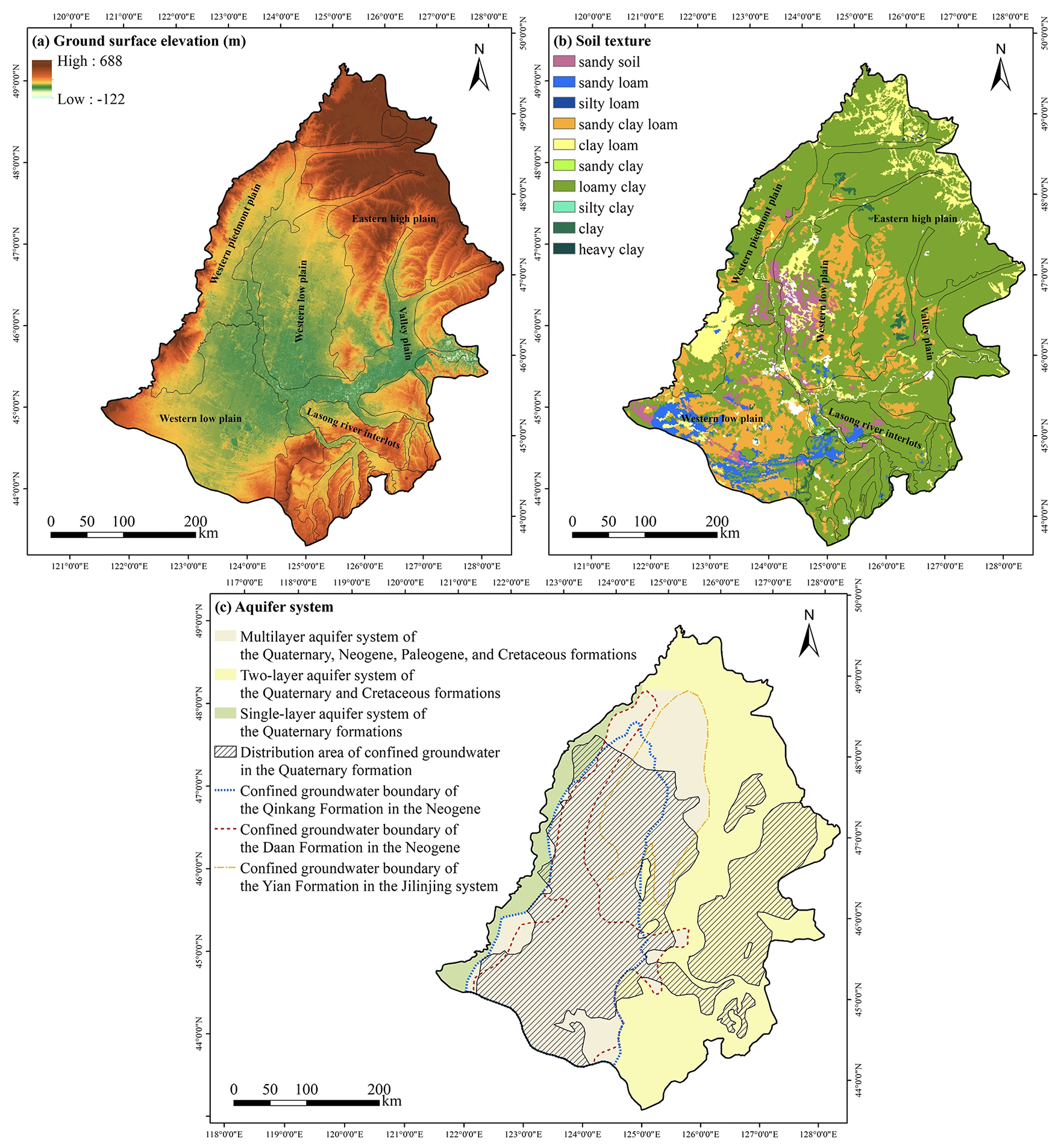 The Songnen Plain is one of the three major plains in Northeast China. It is higher on the periphery and lower at the center, with a total area of 182 800 km2 (Fig. 2a). The study area is surrounded by hills and mountains in the west, north, and east of the Greater and Lesser Xingan, Zhangguangcai, and Changbai Mountains, respectively, and is connected to the West Liaohe Plain by the micro-uplifted Songliao watershed in the south. The Songnen Plain primarily comprises the eastern high plain, western piedmont sloping plain, western low plain, and valley plain (Fig. 2a). The soil texture in the region mainly includes sandy loam, sandy clay loam, clay loam, and loamy clay (Fig. 2b). The climate in the area can be mainly characterized by two main types: first, it features a typical East Asian continental monsoon climate with hot, rainy summers and cold, dry winters; second, although the distribution of the climatic factors in the Songnen Plain is significantly influenced by latitude, there is a distinct east–west difference, with arid conditions in the west and humid conditions in the east (Li et al., 2022). The long-term average temperature of the Songnen Plain is 3.8 °C, the long-term average precipitation is 484.57 mm, and the long-term average evaporation is 1498.1 mm. The frost-free period ranges from 115 to 160 d. Freezing starts in mid-October from north to south, and thawing begins in April from south to north. The freezing depth ranges from 1.5 to 2.4 m (Zhao et al., 2009). The area is crisscrossed by rivers, with the Songhua River, Nenjiang River, and their tributaries forming a centripetal drainage system. The lower reaches of the Nenjiang River and Taoer River, as well as the Second Songhua River, flow through the central plain from the north, west, and southeast, respectively. The aquifer system in the Songnen Plain, China, consists of multiple aquifers ranging from the Cretaceous, Paleogene, and Neogene to the Quaternary. Among them, the Quaternary aquifer, whose distribution range is slightly smaller than that of the Cretaceous aquifer, is the main groundwater exploitation layer in the region and the aquifer in which the groundwater studied in this paper is located (Fig. 2c).