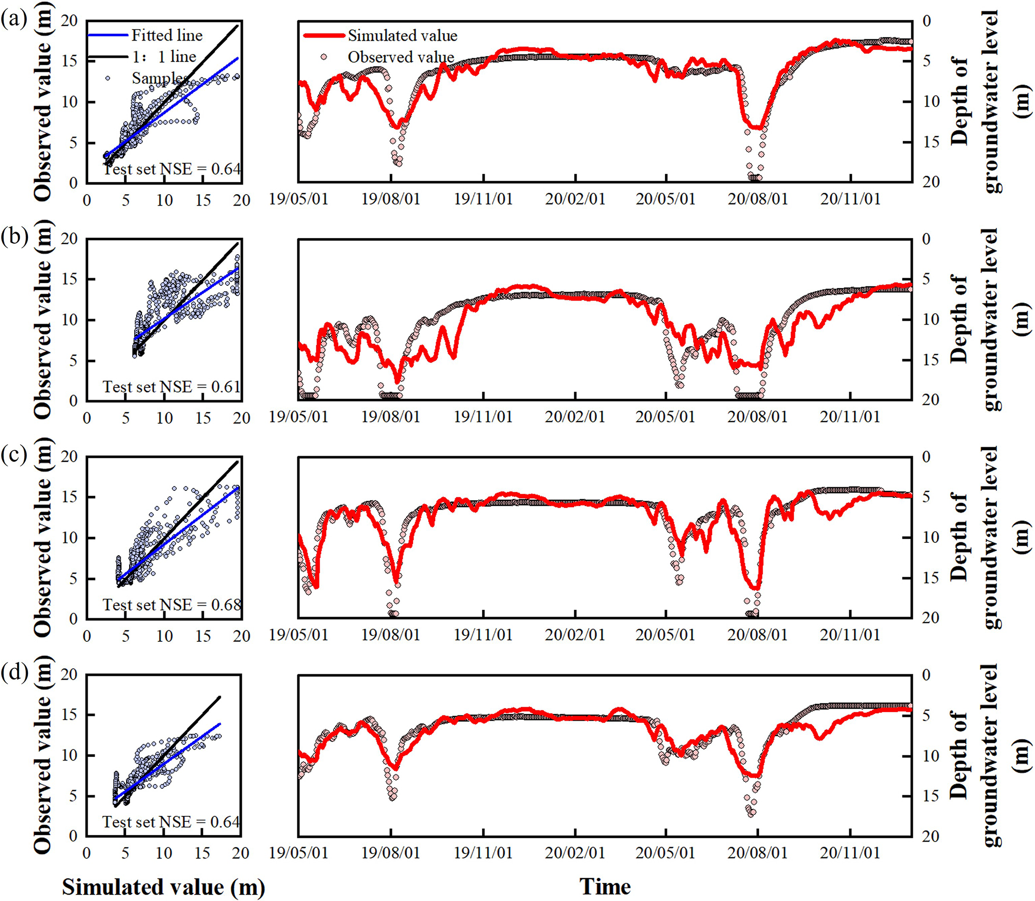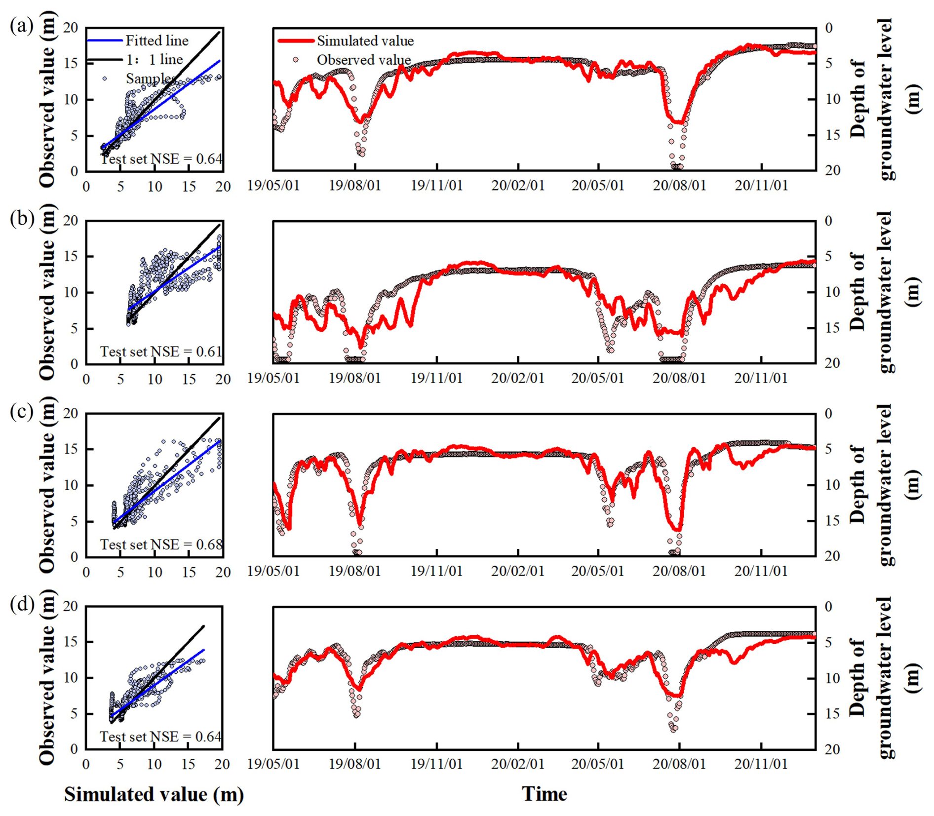 Only 18.11 % of the monitoring wells in the study area had a Nash-Sutcliffe Efficiency (NSE) below 0.7 on the test dataset, and these wells were primarily located in the southern part of the western low plain (Fig. 3a). In this region, the average absolute error between simulated and observed daily groundwater level depth ranged from 0.04 to 2.93 m, although the maximum error reached as high as 11.56 m (Fig. 3c), indicating that the model exhibited certain instability in localized areas. Figure 4 compares the simulated and observed groundwater level depth series at several poorly performing wells in this region. As shown in the figure, significant discrepancies occurred during certain periods, and the fitting performance was unsatisfactory. The primary reason for this discrepancy is the large annual fluctuation in groundwater level depth at many wells in this region: 21.43 % of the monitoring wells had a fluctuation range exceeding 10 m. These extreme fluctuations posed challenges for the LSTM model's simulation accuracy. In the training data used for the LSTM model, samples with extreme values of groundwater level depth were relatively scarce, while samples with moderate values were more abundant. Consequently, the model tended to fit the data in the moderate range more accurately, resulting in limited predictive ability for the extreme ends of the groundwater level series. Despite the reduced accuracy at certain wells, the LSTM model is capable of accurately capturing the variation trend of groundwater levels, and no significant lag is observed between the simulated and observed values (Fig. 4). The Pearson correlation coefficients between the simulated water levels and the measured water levels at the four representative monitoring points shown in the figure are 0.86, 0.81, 0.87, and 0.85, respectively. Moreover, the correlation coefficients reach their maximum values without applying any time lag, indicating that the simulated values can effectively and promptly reflect the actual variation trend of groundwater levels.