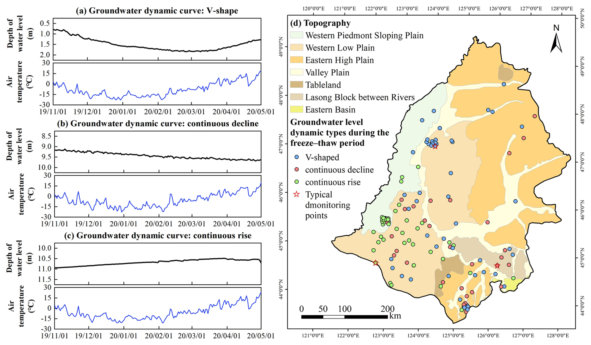 Figure 6(a–c) Dynamic curves of different groundwater types during the freeze–thaw period and corresponding changes in air temperature; (d) Spatial distribution of different groundwater level dynamic types during the freeze–thaw period in the Songnen Plain, China. The dynamic curves of the groundwater level exhibiting patterns of (a) V-shaped, (b) continuous decline, and (c) continuous rise correspond to the unconfined aquifer monitoring wells numbered 230204210070, 220182210411, and 220802210145, respectively.
