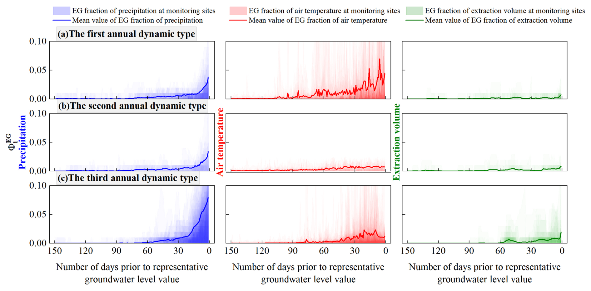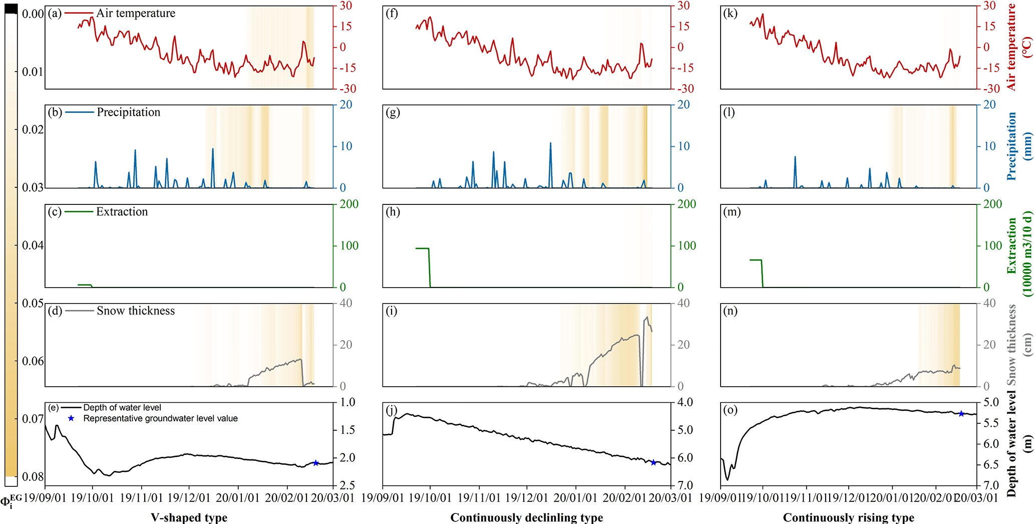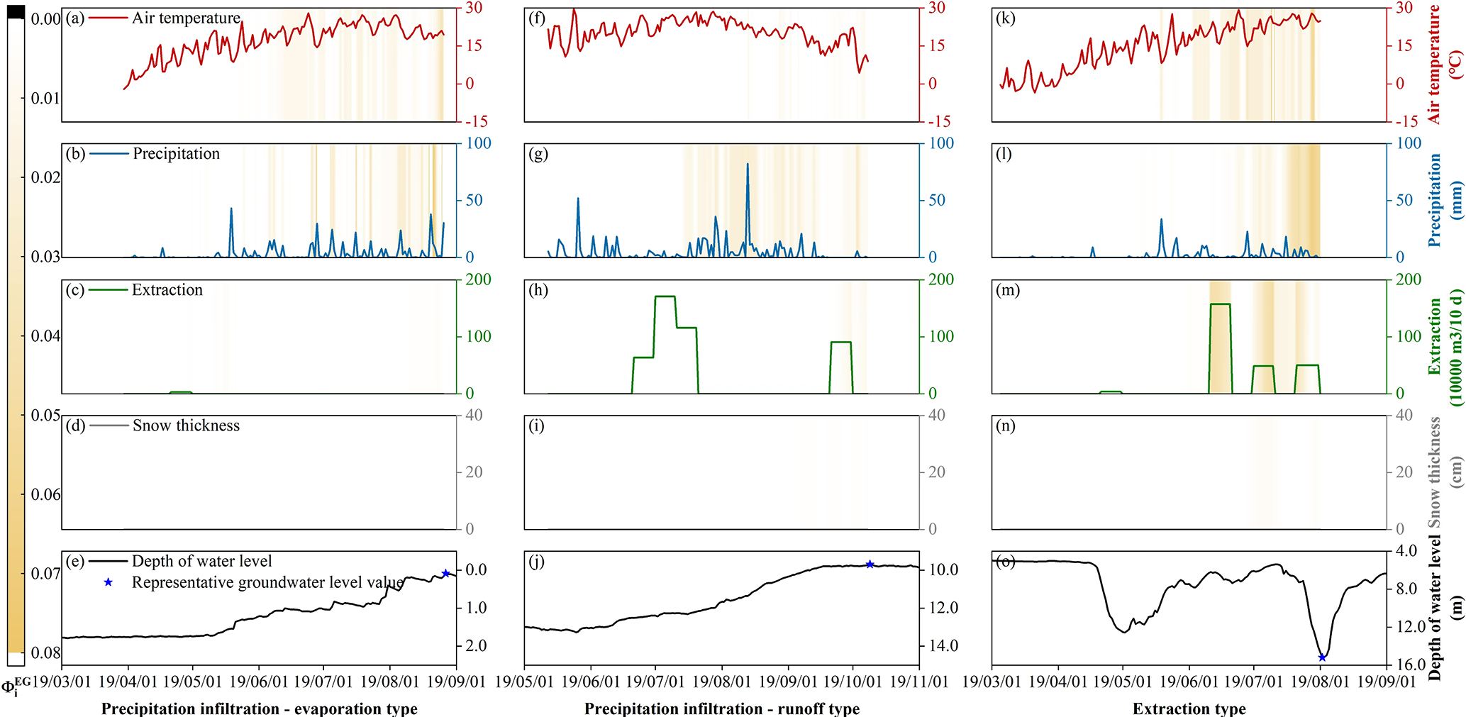 In the third annual dynamic type, the precipitation, air temperature, and extraction volume had a significant impact on groundwater level within a shorter period before the representative groundwater level values (within 60 d), with the average EG scores in the ranges of 0–0.08, 0–0.02, and 0–0.02, respectively (Fig. 7c). This dynamic type is mainly distributed in agricultural irrigation areas, such as the southern part of the western low plain and the western piedmont sloping plain (Fig. 5a). The main crops in these areas are rice, soybeans, and corn (You et al., 2021), and their water demand is concentrated in the summer, particularly between June and August (Xing et al., 2022). During this period, the air temperature shows a fluctuating uptrend (Fig. 9k), with the EG scores reaching a maximum of 0.02, indicating that high temperatures increase soil evaporation and crop transpiration. This leads to a higher water demand from the crops; however, the low rainfall was insufficient to meet this demand during these periods (Fig. 9l, with a daily maximum precipitation of only 33.80 mm), necessitating additional groundwater extraction for irrigation to maintain crop growth (Fig. 9m). As a result, the EG score for the extraction volume reached approximately 0.20 during this period, and groundwater level decreased accordingly (Fig. 9o). This dynamic type indicates that groundwater recharge comes from precipitation infiltration, and groundwater extraction is the main discharge mechanism. Thus, the third annual groundwater dynamic type was classified as the extraction type.