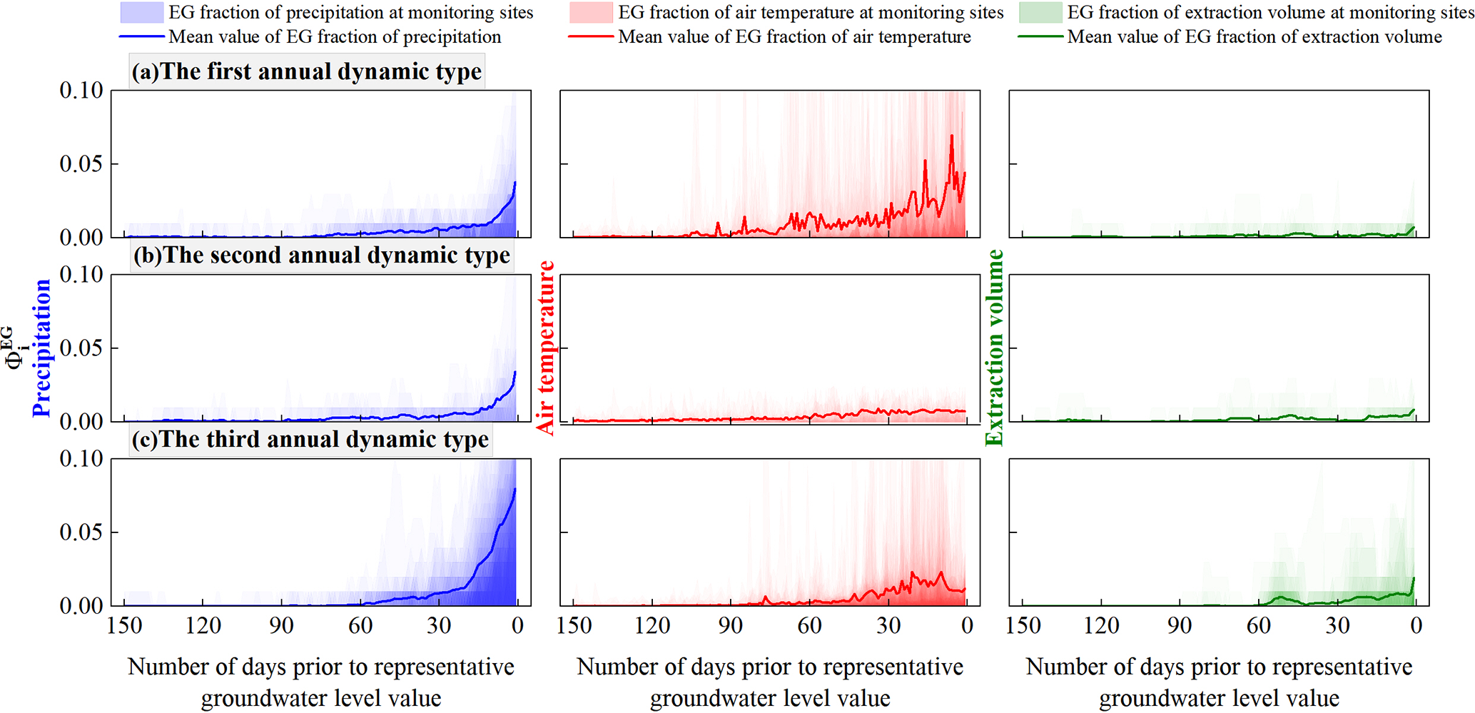 Within 90 d before the representative groundwater level values, the average EG scores for the precipitation and air temperature in the first annual dynamic type ranged from 0 to 0.04 and from 0 to 0.07, respectively, while the average EG score for the extraction volume did not exceed 0.01 (Fig. 7a). This indicates that the groundwater level depth in this dynamic type was significantly influenced by precipitation and air temperature, while the effect of extraction was negligible. Thus, the changes in the groundwater level depth may be related to the precipitation infiltration–evaporation process. When a pronounced precipitation peak occurred (Fig. 9b), the EG score increased significantly (exceeding 0.15), corresponding to a rise in groundwater level (Fig. 9e), indicating that precipitation infiltration made a substantial contribution to the groundwater level increase. Within the 90 d when precipitation influenced the representative groundwater level value, a total precipitation of 408.09 mm led to an overall rise in the groundwater level by 1.12 m (Fig. 9b and e). During periods without precipitation, the air temperature continued to rise (Fig. 9a), reflecting higher soil evaporation. At this time, the EG score for the air temperature was also relatively high (ranging from 0.10 to 0.20), and the groundwater level showed a slight decline (Fig. 9e). This suggests that evaporation was the primary discharge mechanism for groundwater in this dynamic type. Therefore, based on the groundwater recharge and discharge mechanisms, the first annual groundwater dynamic type is summarized as the precipitation infiltration–evaporation type.