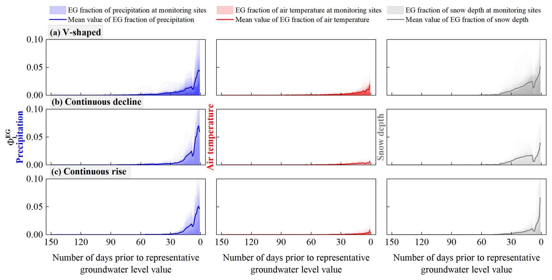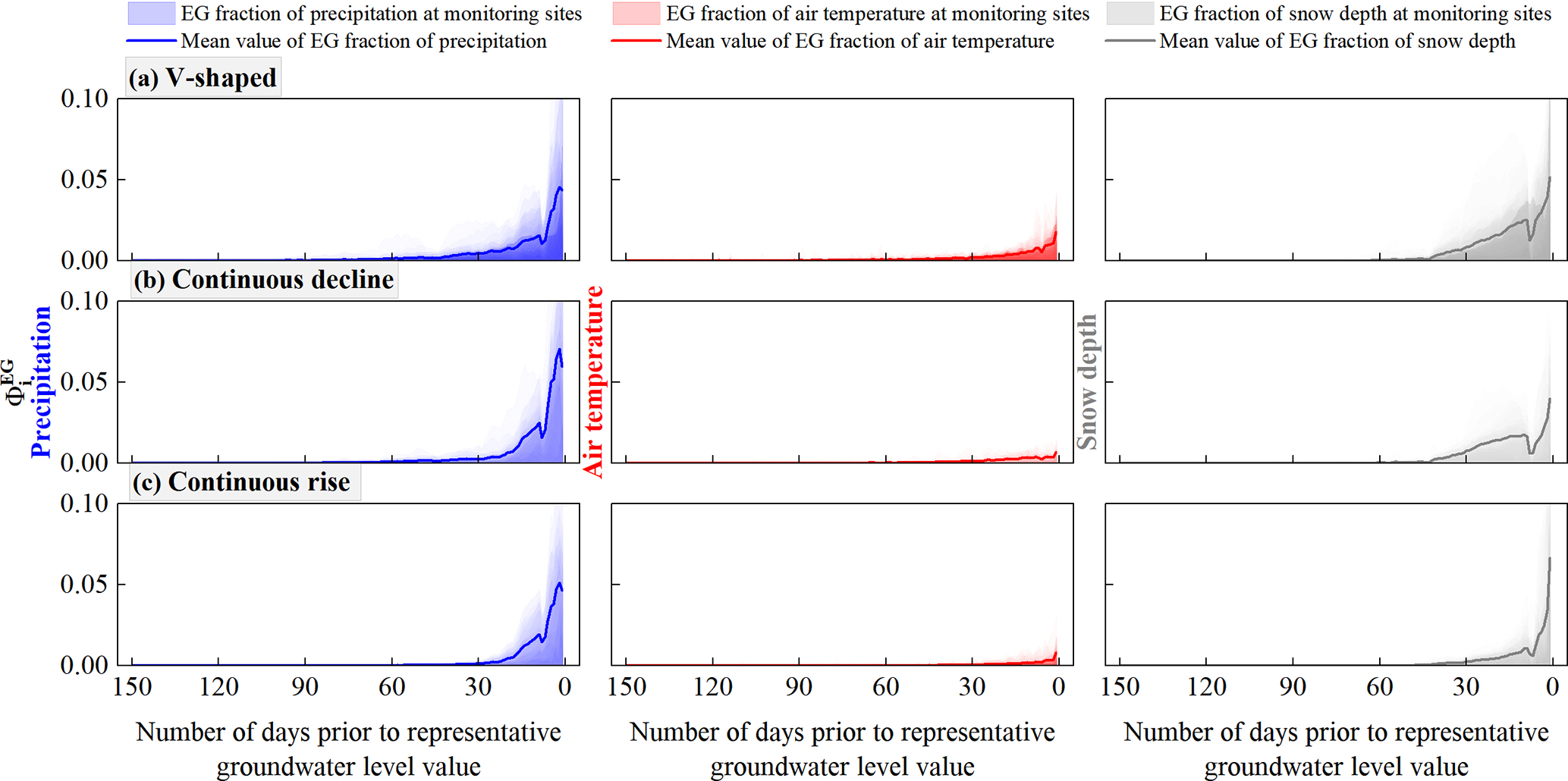 For the continuously declining and continuously rising dynamic types, only precipitation and snow depth affected the groundwater level depth during the freeze–thaw period. In the continuously declining groundwater dynamic type, the precipitation and snow depth influenced the groundwater level depth over a longer period before the representative groundwater level values (within 60 d), with the average EG scores below 0.07 and 0.04, respectively (Fig. 8b). In the continuously rising groundwater dynamic type, the average EG scores for the precipitation and snow depth within 30 d before the representative groundwater level values ranged from 0 to 0.05 and from 0 to 0.07, respectively, indicating that precipitation and snow depth affected the groundwater level depth in this dynamic type during the freeze–thaw period (Fig. 8c). Compared with precipitation and snow depth, the impact of the air temperature on the groundwater level in both dynamic types was negligible (Fig. 8b and c), with the average EG scores ranging from 0 to 0.01.
