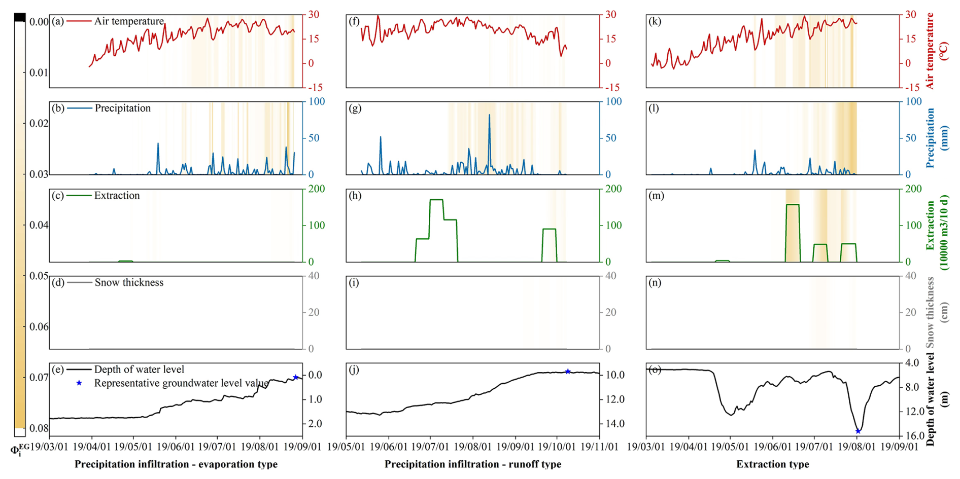 After the application of the EG method to the trained models for the 138 groundwater level simulations, the EG scores () were obtained for precipitation, air temperature, extraction volume, and snow depth within 150 d prior to the representative groundwater level values for each annual and freeze–thaw period groundwater level dynamic type (Figs. 7 and 8).