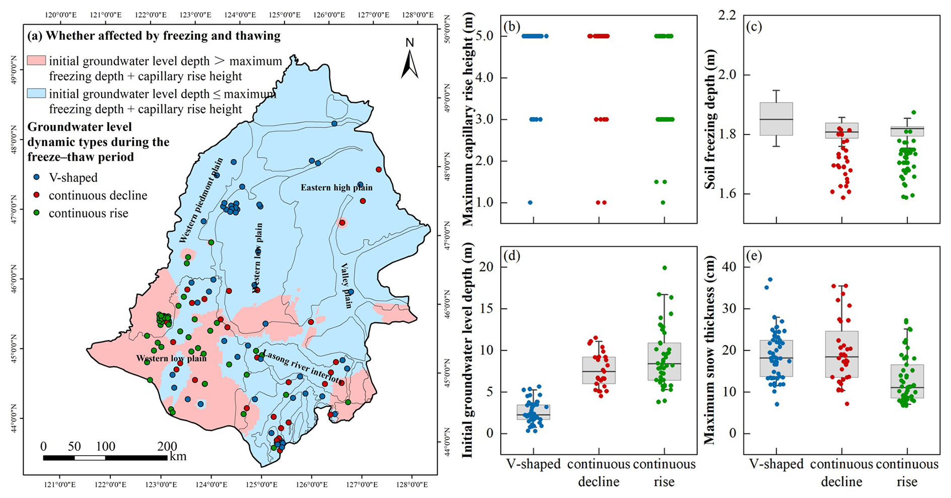 Figure 12(a) Spatial distribution of whether the groundwater level is affected by the soil freeze–thaw process and the three groundwater level dynamic types during the freeze–thaw period (V-shaped, continuously declining, and continuously rising) in the Songnen Plain, China. Correlations between the groundwater level dynamic types in the three freeze–thaw period and (b) maximum capillary rise height of the soil, (c) the soil freezing depth, (d) the initial groundwater level depth at the start of the freezing period, and (e) maximum snow thickness. Each point in (b)–(e) represents a groundwater monitoring well.