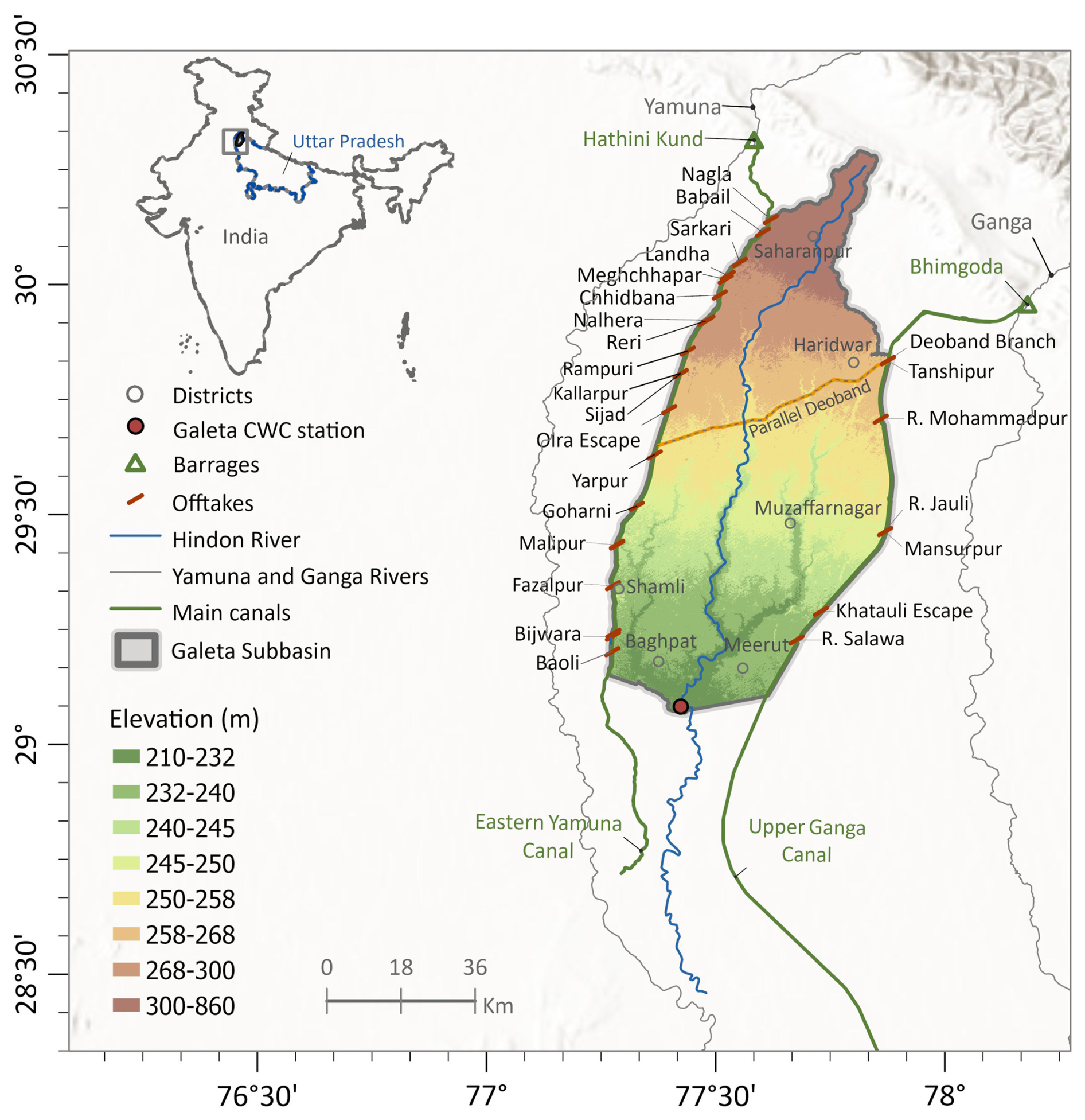 Figure 1Location of the Hindon basin in the Uttar Pradesh state of India (inset map); with a detailed view of the basin featuring its boundaries, topographic profile, location of the Galeta outlet, where a river discharge station that belongs to the Central Water Commission (CWC) network of India is located. The main map shows the irrigation scheme with reservoirs and canal system. Topographic basemap sources: Esri, USGS, FAO, NPS, GIS user community, and others | Powered by Esri.