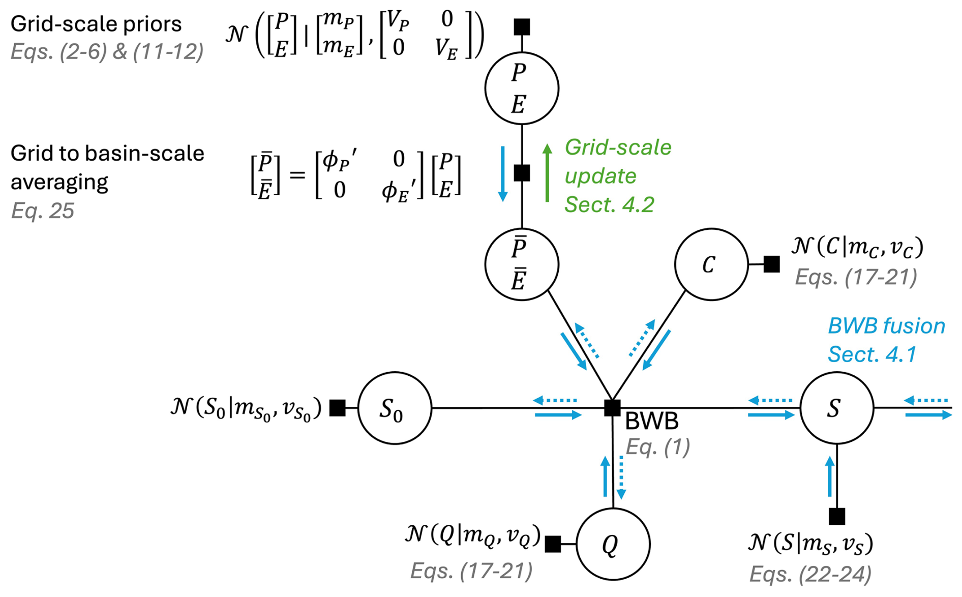 Figure 2A factor graph showing random variables in circles and constraints between variables as squares for a single month. Three constraints are incorporated in the water balance data fusion method, including: a prior Gaussian distribution assigned to each water balance variable (squares attached to each variable), the basin-scale water balance (BWB) constraint that links all water balance variables together, and the spatial averaging constraint that links grid-scale precipitation (P) and evaporation (E) to basin-scale precipitation () and evaporation (). Computation of posteriors of individual variables proceeds in two steps. The first step is basin-scale water balance data fusion (BWB fusion, see Sect. 4.1). This step involves multiple forward (blue arrows along the edges) and backward (dotted blue arrows) passes over the data using the entire timeseries to compute the posteriors of all water balance variables that jointly close the water balance (Schoups and Nasseri, 2021). The second step computes grid-scale posteriors for precipitation and evaporation from their basin-scale posteriors using a Kalman smoothing algorithm (green arrow, see Sect. 4.2).