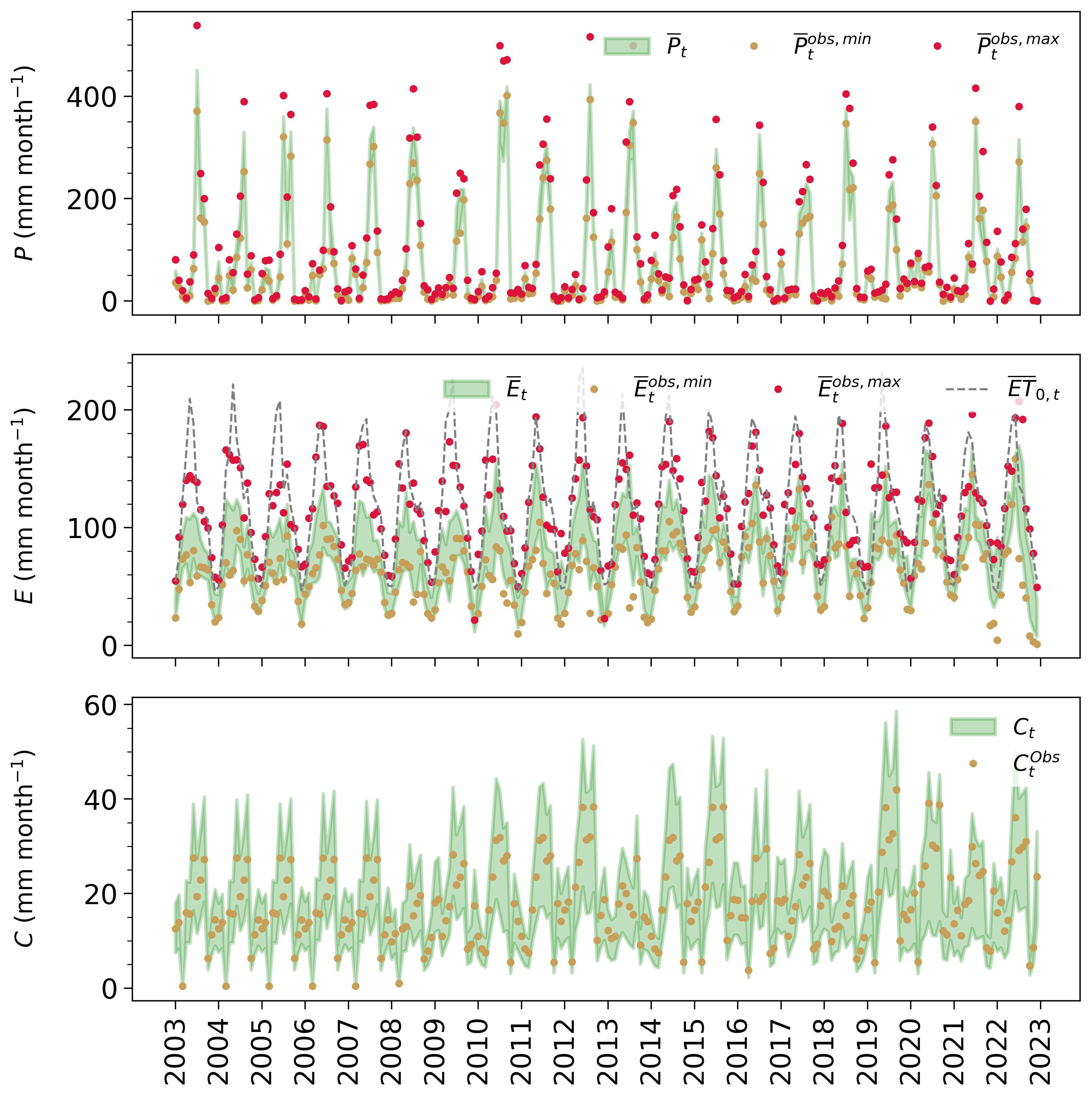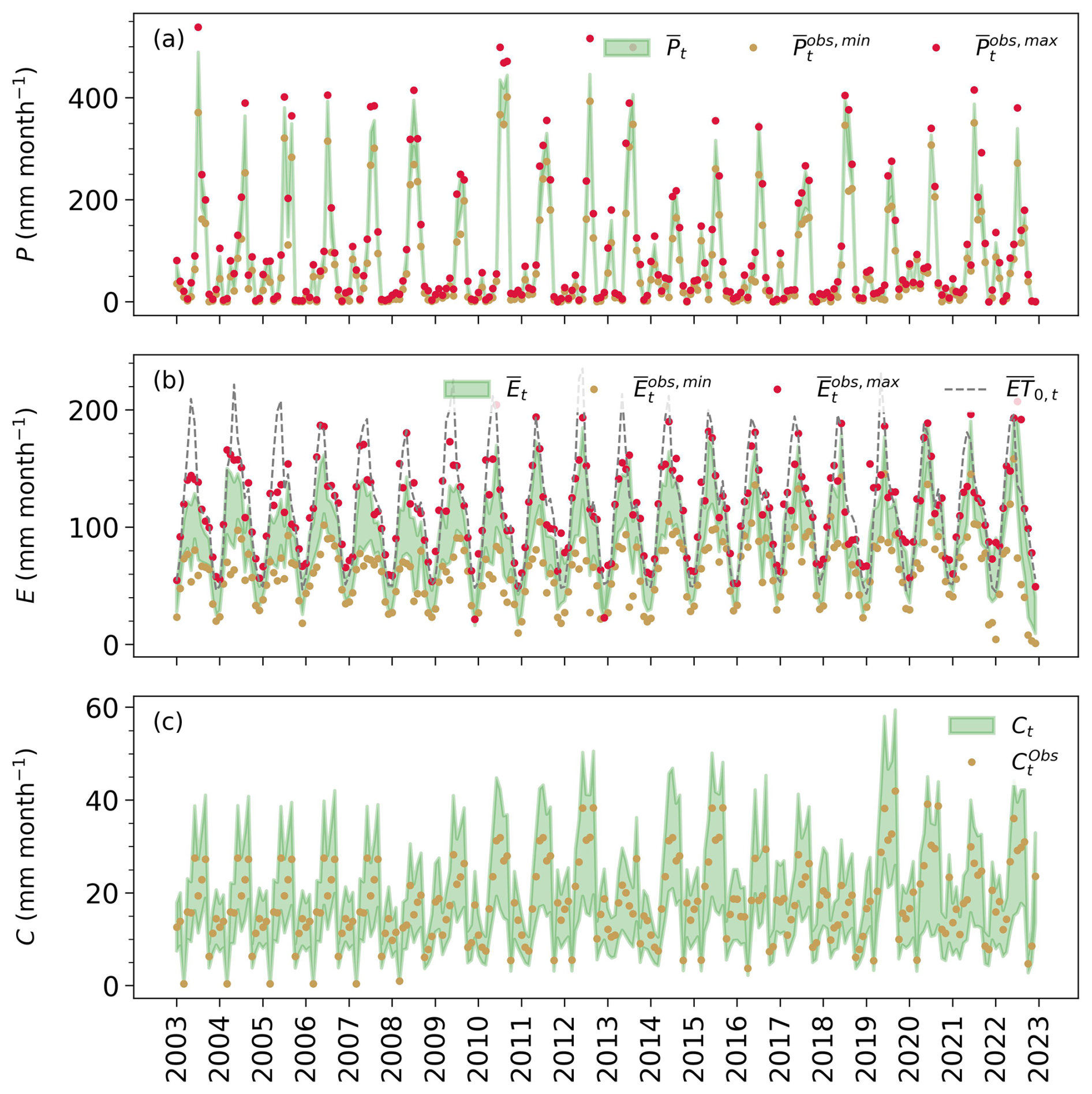 Figure 3Monthly water balance posteriors (90 % credible intervals in green) for: (a) P (precipitation), (b) E (actual evapotranspiration), and (c) C (canal water imports), and their corresponding observations (dots). Reference evapotranspiration computed here using ERA5 meteorological input variables is shown as (ET0). The overbars of the labels in P and E plots indicate that these values are obtained through spatial averaging of the gridded data sets for each month t. Each year's label indicates the start of the year (January).