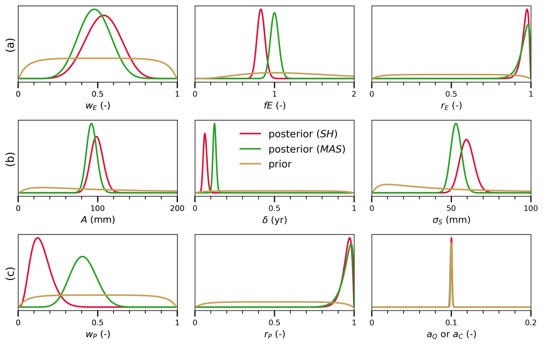 Figure 4Prior and posterior distributions of error parameters for: (a) evaporation, (b) storage, (c) precipitation, canal water import, and river discharge when using different GRACE storage data sets: CSR Spherical Harmonic (SH) and JPL Mascon (MAS) solutions.