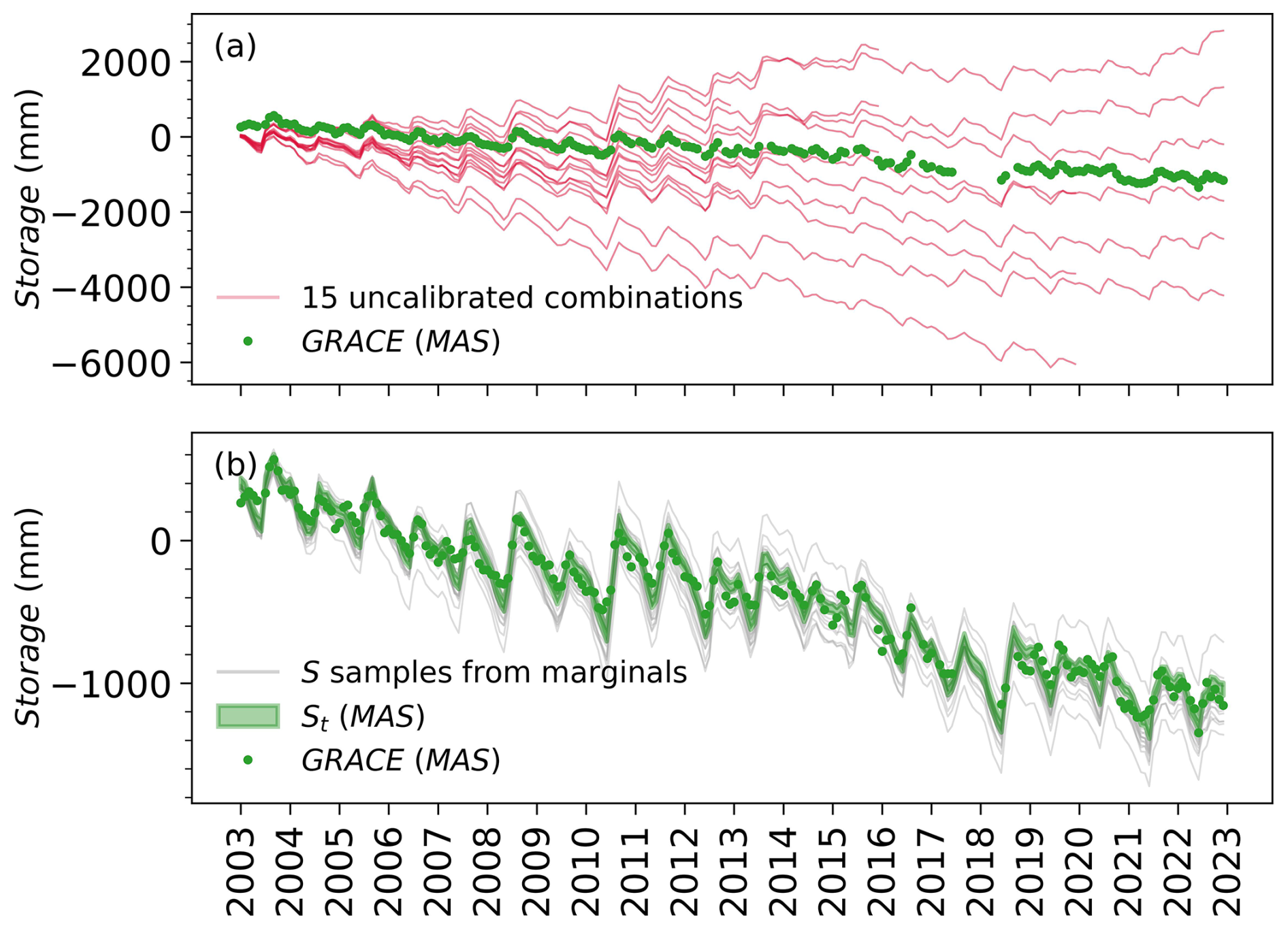 Figure 5Monthly timeseries of GRACE-JPL Mascon observations and storage anomalies predicted from the water balance: (a) using 15 unique uncalibrated combinations of the input variables (S0, P, E, Q, C), and (b) using posterior (calibrated) estimates of the input variables (S0, P, E, Q, C) with (green band) and without (gray lines) accounting for posterior cross-correlation between the input variables.