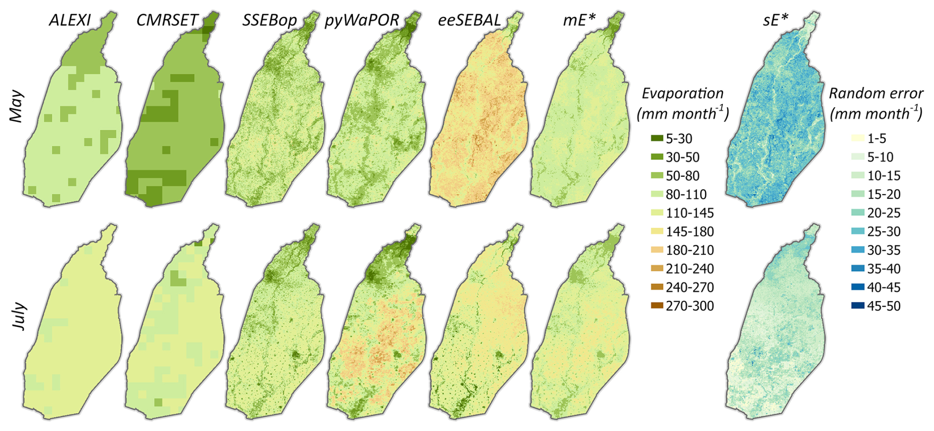 On the other hand, Eq. (12) quantifies the random errors in grid-scale evaporation, as the difference between the maximum and minimum evaporation in each grid cell. A noise parameter (rE), taking a value between 0 and 1, is used to scale the random errors. All parameters are solved as part of the water balance data fusion (Sect. 4).