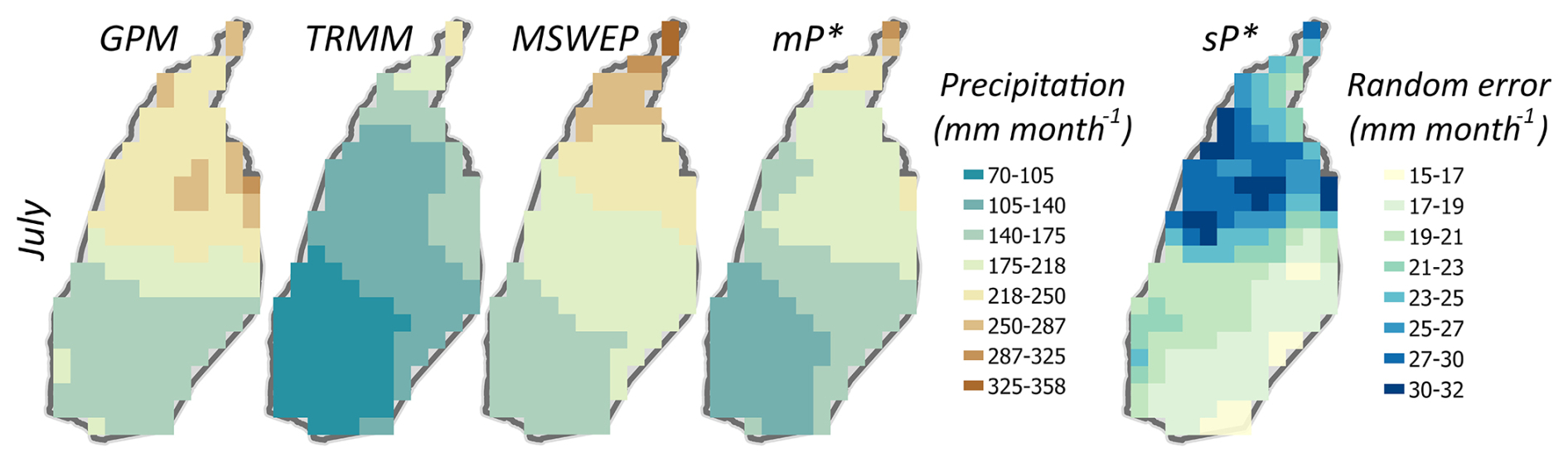 Figure 7Prior observations and estimated posteriors of grid-scale precipitation P for the peak rainy month (July 2009); and denote the posterior mean and standard deviation of precipitation.