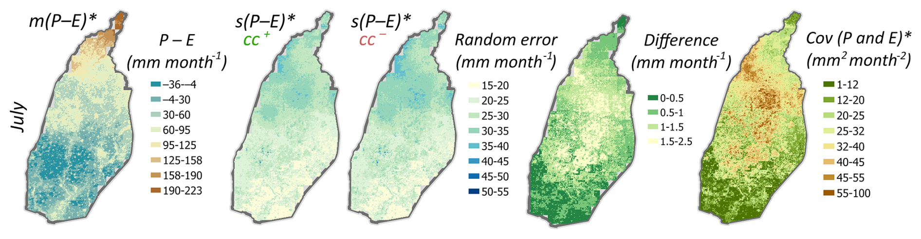 Via Eq. (29), the posterior cross-correlation between water variables at the basin scale is propagated to the grid scale, and thus results in posterior cross-correlation between grid-scale P and E as well. The effect of this can be illustrated by computing derived variables that involve both P and E. An example is given in Fig. 8, which shows maps of the posterior mean and standard deviation of P−E for July 2009, the latter with and without posterior cross-correlation between P and E. Due to positive posterior cross-correlation between P and E (since they have opposite signs in the water balance), the posterior standard deviation of P−E decreases when accounting for this correlation, but the effect in Fig. 8 is relatively small, and is observed at some localized spots with the highest reduction in errors of up to 2.5 mm month−1. These spots correspond to the locations at which both P and E covary the most, with the cross-covariance subtracted during the computation of the P−E posterior variance. The reason for this relatively small effect is that the water balance constraints introduce other posterior cross-correlations as well, both at the basin scale (Table 2) and at the grid scale via nonlocal posterior cross-correlations between P and E induced by Eq. (29) (i.e., in the posterior, P in a grid cell becomes correlated with E in all other grid cells).