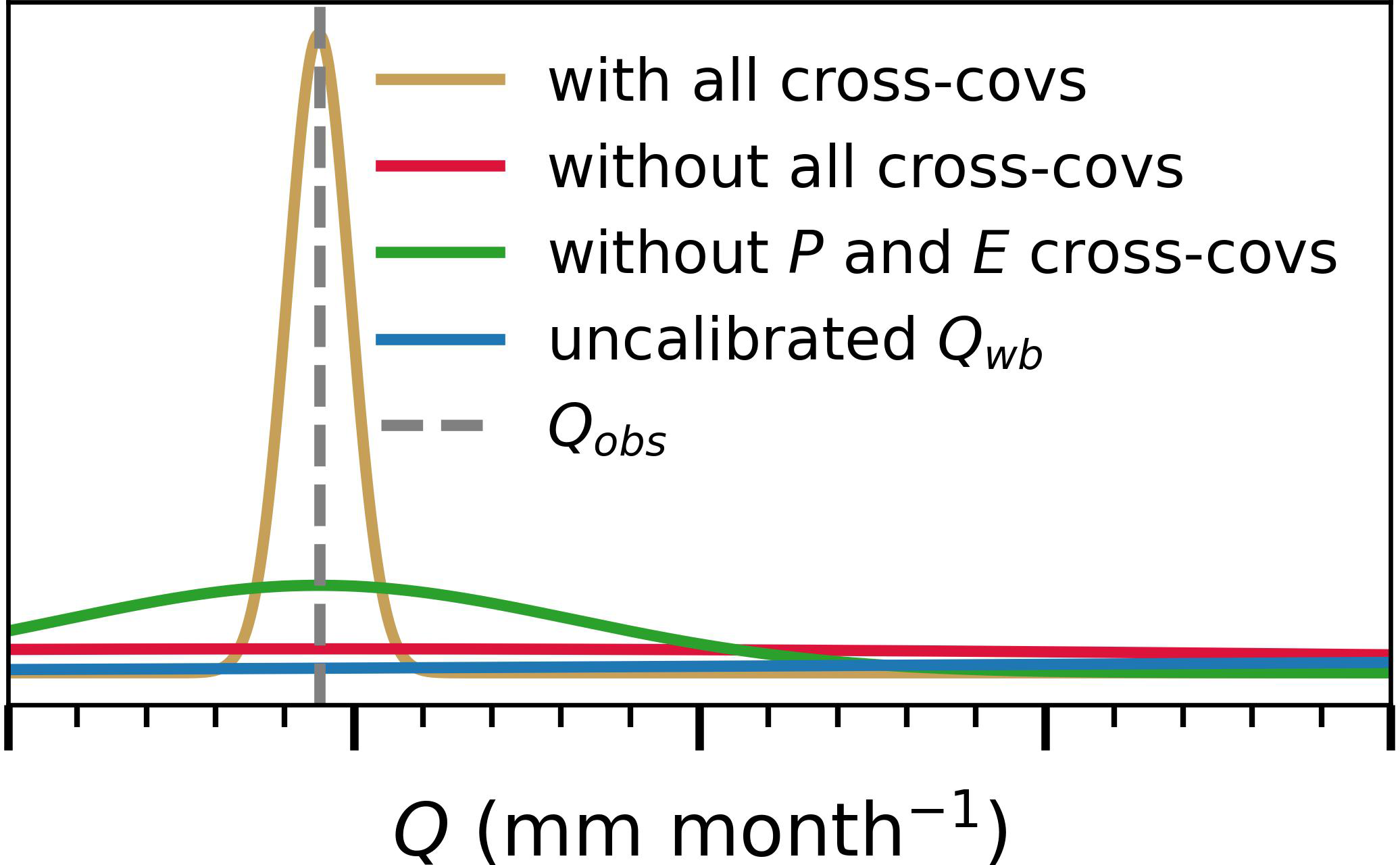 To evaluate the effect of ignoring the posterior correlation between P and E, we calculated the distribution of Q from the water balance given the posterior of all other variables for three cases: (i) ignoring all posterior correlation, (ii) ignoring only correlation between P and E, (iii) accounting for all correlation. We compare these distributions to a fourth scenario (iv) in which Q is obtained from uncalibrated water balance data. Writing the water balance (Eq. 1) in terms of Q results in 15 uncalibrated Q estimates generated from the unique combinations of the water balance data. The distribution for this case is characterized in terms of mean (average across the 15 uncalibrated values) and uncertainty (set as the spread across these values). The results in Fig. 9 indicate that neglecting the posterior cross-correlation between P and E and between all water balance variables, can substantially lead to higher uncertainties (wider distributions), compared to when cross-correlations between all variables are accounted for (narrow distribution). At the extreme end, the Q predicted from the uncalibrated water balance data demonstrated the highest level of uncertainty compared to all other cases, with physically inconsistent values (negative) and a mean value greatly deviating from the observed Q value. We repeat this experiment for all months and report the performance of the estimated Q from the different approaches compared to the observed Q estimates. We obtain a low RMSE value of the calibrated Q posterior mean (0.7 mm month−1) compared to Qwb from uncalibrated water balance data (74 mm month−1), which underscores the importance of (i) water balance data fusion for bias-correcting the original data products and (ii) accounting for posterior correlation, when water balance variables (P, E, C, S) are to be used for computing Q.