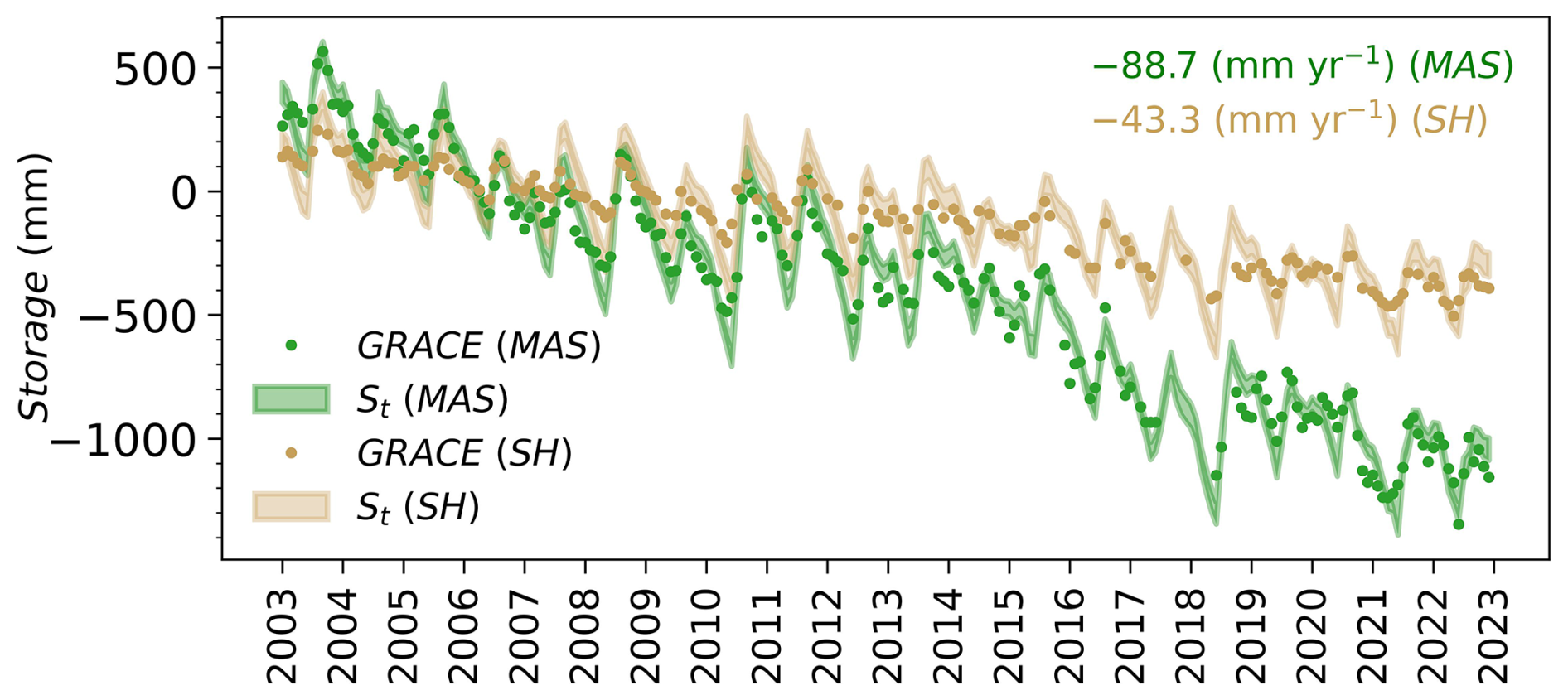 The Hindon basin studied here is experiencing groundwater depletion (Alam and Umar, 2013). Storage data from GRACE satellite has been used to estimate human-driven water storage changes, such as those caused by intensive irrigation. This data is either based on spherical harmonic coefficients or mascon basis function, which entails testing the sensitivity of the water balance closure to the chosen GRACE input. The baseline results presented in Sect. 5 are based on GRACE-JPL Mascon (MAS) solution. Here, we compare these results to those obtained using the CSR spherical harmonic (SH) solution.