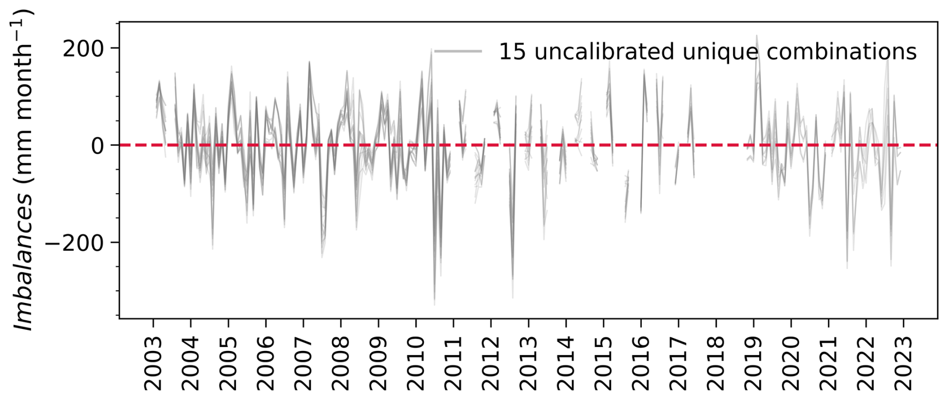Studies addressing the uncertainties in RS water balance data often rely on in situ data (treated as “ground-truth”) to evaluate and converge on the different data products. However, in situ data (e.g., evaporation) is sparsely measured, and even when these data exist, accessibility may be challenging. Under such conditions, alternative indirect approaches such as triple collocation (Tian and Peters-Lidard, 2010; Long et al., 2014; Massari et al., 2017; Yin and Park, 2021), uncertainty propagation (Hong et al., 2006; Cawse-Nicholson et al., 2020), and sensitivity analyses (Sobol, 2001) can be utilized. Other methods involve using the deviation from the ensemble mean, and the variability between the data sets as a proxy for uncertainty (Tian and Peters-Lidard, 2010; Sahoo et al., 2011; Munier et al., 2014; Zhang et al., 2018). Each of the previously summarized error estimation techniques has its inherent merits and shortcomings. In an attempt to capitalize on these strengths, Mourad et al. (2024) recently integrated limited in situ data and multiple error metrics, along with expert judgment, to quantify and partially reduce water balance data errors. However, the resulting water balance estimates require further conditioning on in situ data using additional constraining steps, which is a subject of the methodology section of the current study.