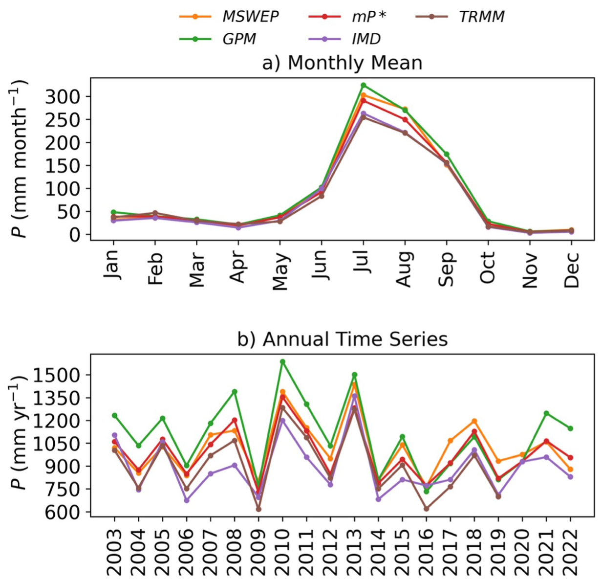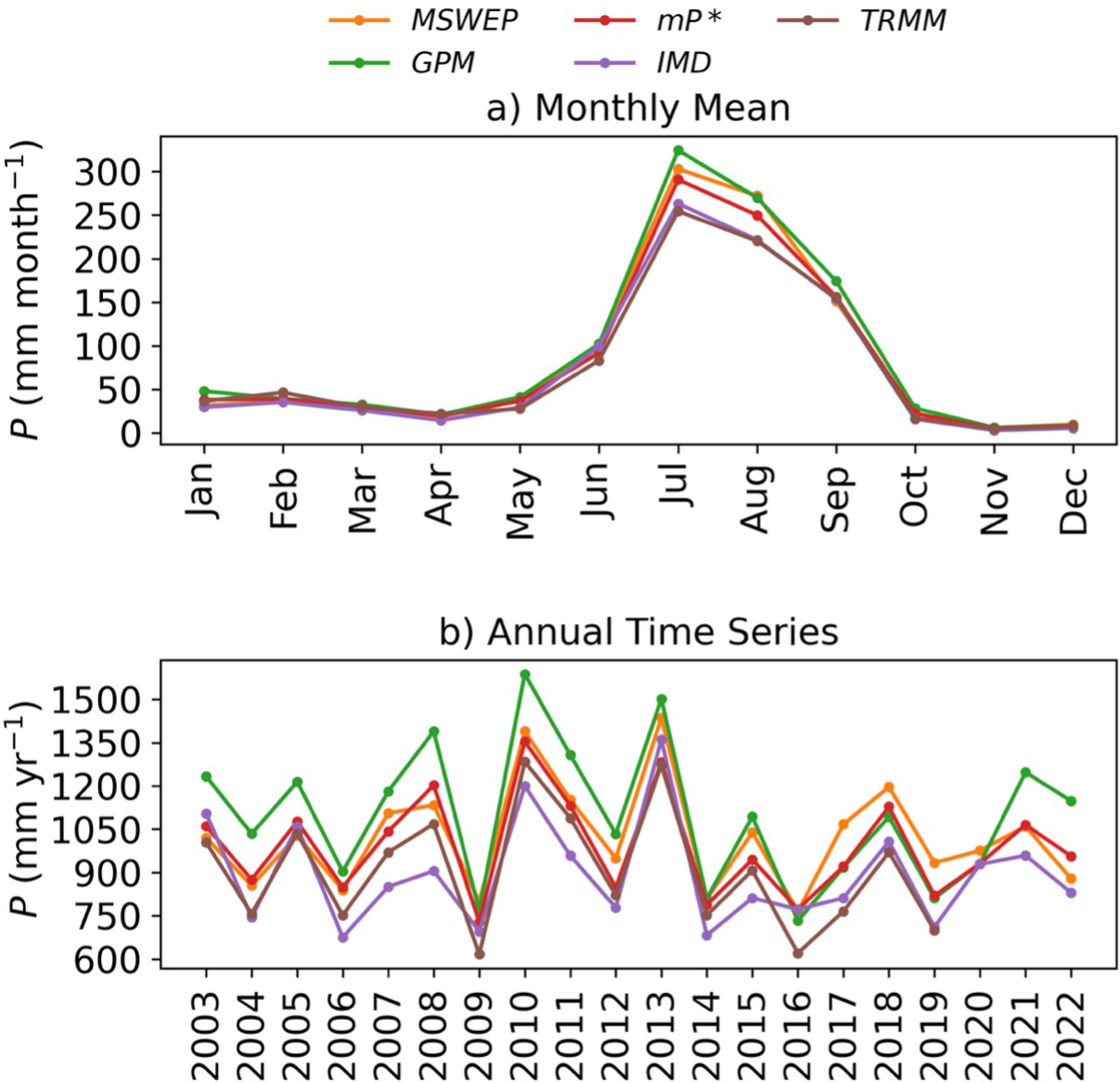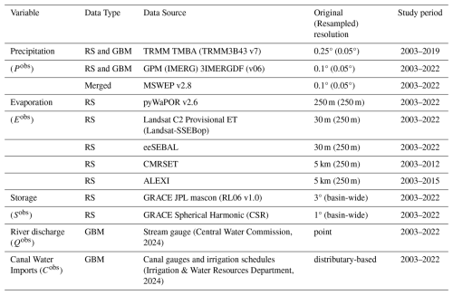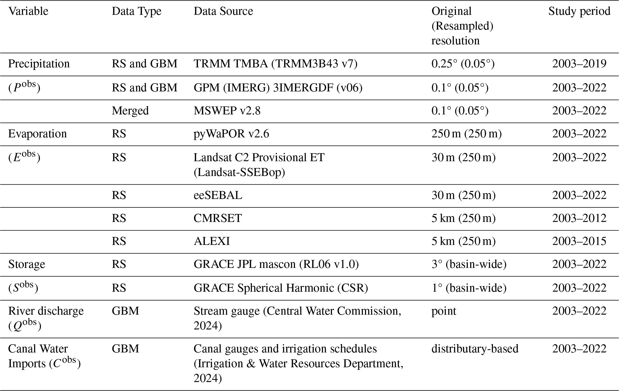 Each water balance component in Eq. (1) is independently derived, gathered, or measured either from satellite data, ground-based measurements, or both (Table 1). In the prior selection of the most reliable precipitation and evaporation ensembles (see Mourad et al., 2024), we followed other water balance closure studies that emphasize the use of earth observations over model outputs to minimize the effect of their related assumptions, except for the Multi-source Weighted-Ensemble Precipitation (MSWEP v2.8) product (Beck et al., 2019). MSWEP is an “optimal merging” of gauge observations, satellite observations, and reanalysis model output. Along with MSWEP, we use two other monthly gridded precipitation ensemble members: the Tropical Rainfall Measuring Mission (TRMM) (Huffman et al., 2007) and the NASA/JAXA Global Precipitation Measurement (GPM-IMERG) (Huffman et al., 2019). By combining precipitation radar, passive microwave, and infrared satellites with ground-based observations from the Global Precipitation Climatology Centre (GPCC), TRMM and GPM-IMERG provide a comprehensive precipitation estimate over a given area. Compared to single-band radar on TRMM, GPM dual-frequency precipitation radar provides a broader range of measurable precipitation rates and a better estimate of precipitation particle size (Hou et al., 2014). Spatially interpolated rain-gauge for the basin from Indian Meteorological Department (IMD) data set (Pai et al., 2014) is included in this analysis for comparison but not used in the model.