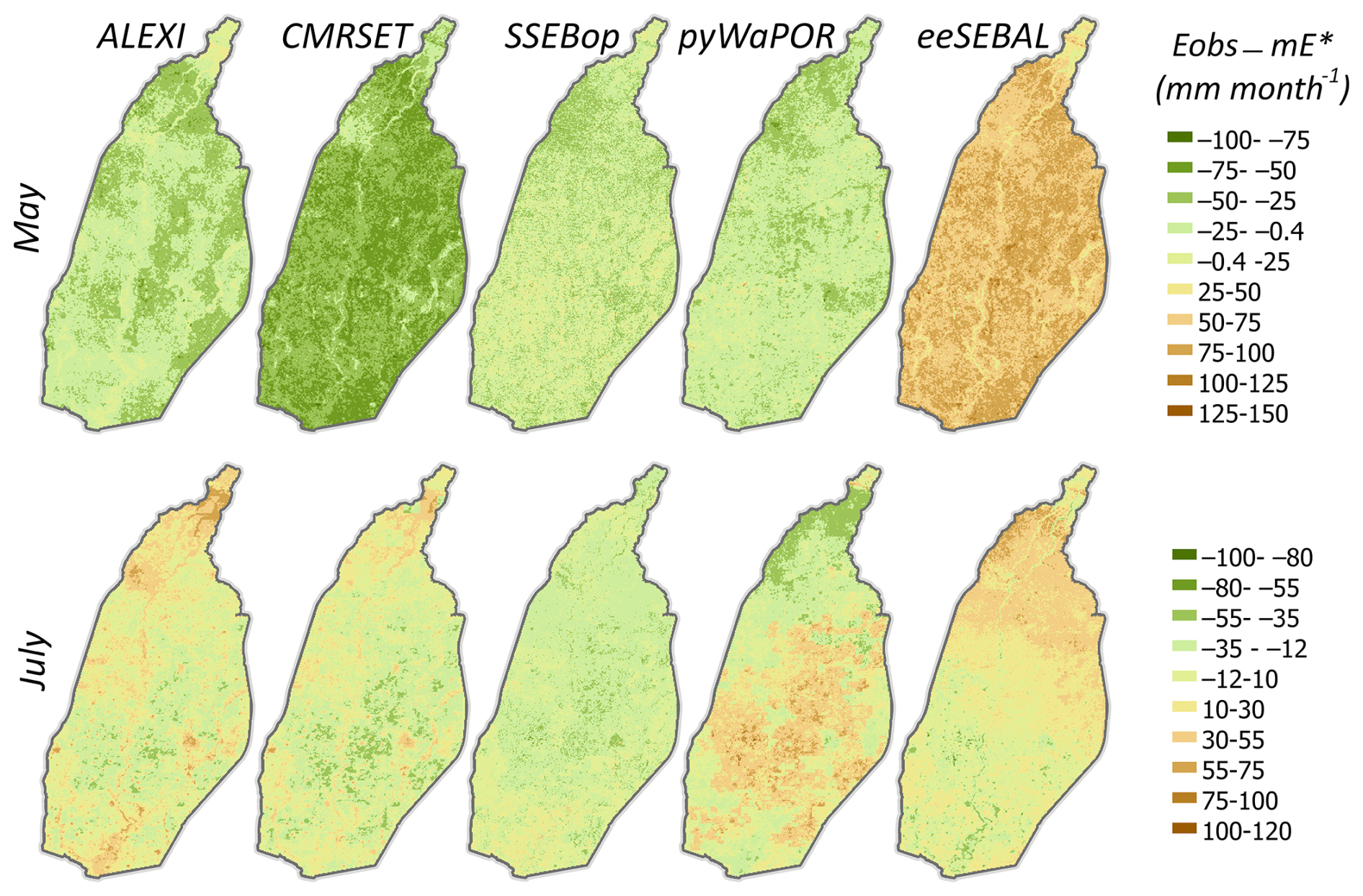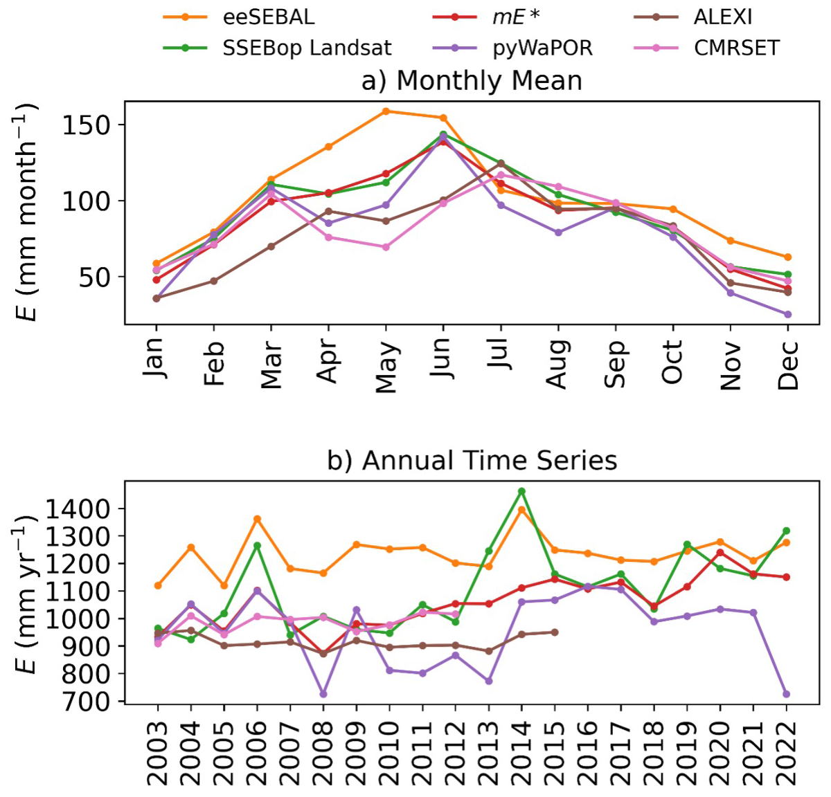 For gridded evaporation ensembles, we incorporate five members with diverse methodological approaches for estimating evaporation from remote sensing. One ET data set based on two-parallel Penman-Monteith (PM) models for both canopy and soil: the pyWaPOR-ET v2.6 (Bastiaanssen et al., 2012), two ET data sets that estimate ET from a single-source surface energy balance (SEB) model representing vegetation and soil in a combined energy balance, namely the Landsat Collection 2 Provisional Actual Evapotranspiration Science Product (Landsat-based SSEBop ET) (Senay, 2018; Senay et al., 2023) and the Surface Energy Balance Algorithm for Land (eeSEBAL product) (Bastiaanssen et al., 1993), in addition to a two-source SEB ALEXI-ET data set from the Atmosphere-Land Exchange Inverse model (Anderson et al., 2007, 2015). We also incorporate the CMRSET ET product based on the CSIRO MODIS Reflectance-based Scaling ET model (Guerschman et al., 2009) that uses vegetation indices and meteorological data for scaling the ET. All data sets are resampled to the same spatial resolution using bilinear interpolation. More details on the theoretical background and processing steps for the P and E data sets can be found in the companion paper (Mourad et al., 2024).