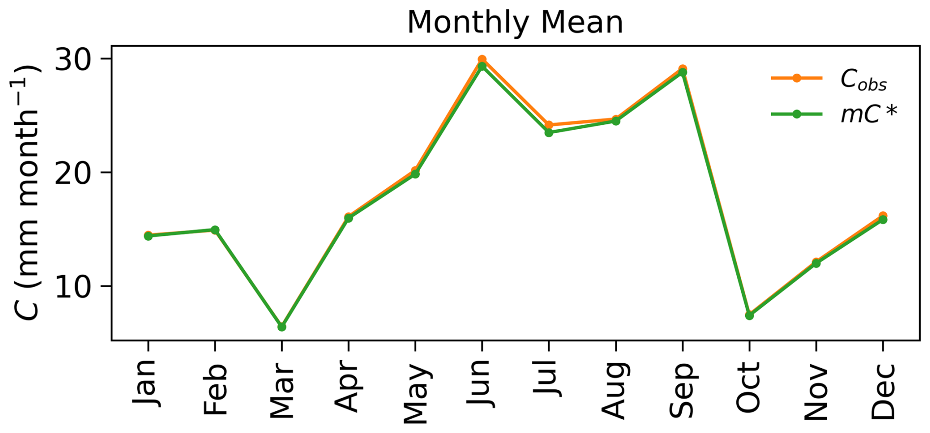 The total water storage variable data were obtained from the recent release of the monthly Jet Propulsion Laboratory (JPL-RL06) mascon solution. Each monthly total water storage estimate represents the surface mass anomaly relative to the baseline average over 2004–2009. This version relies on prior geophysical information to constrain the solution, eliminating the need for empirical de-striping filtering commonly used for post-processing traditional spherical harmonic gravity solutions. However, intrinsic to this product are biases, that is, leakage errors, and spatial smoothing that damps the “true” signal, especially in small-sized basins. A Coastline Resolution Improvement (CRI) filter has been applied in this version to reduce signal leakage errors across coastlines (Wiese et al., 2016). This data is also accompanied by scaling factors for optionally restoring the damped signal. However, these were not applied to the data used herein; instead, bias along with noise variance are modeled using all water balance data incorporated in this study (see Sect. 3.3). Another storage input data set is also included: GRACE Spherical Harmonic (CSR) solution (Sect. 6.1) (Swenson and Wahr, 2006; Landerer and Swenson, 2012).