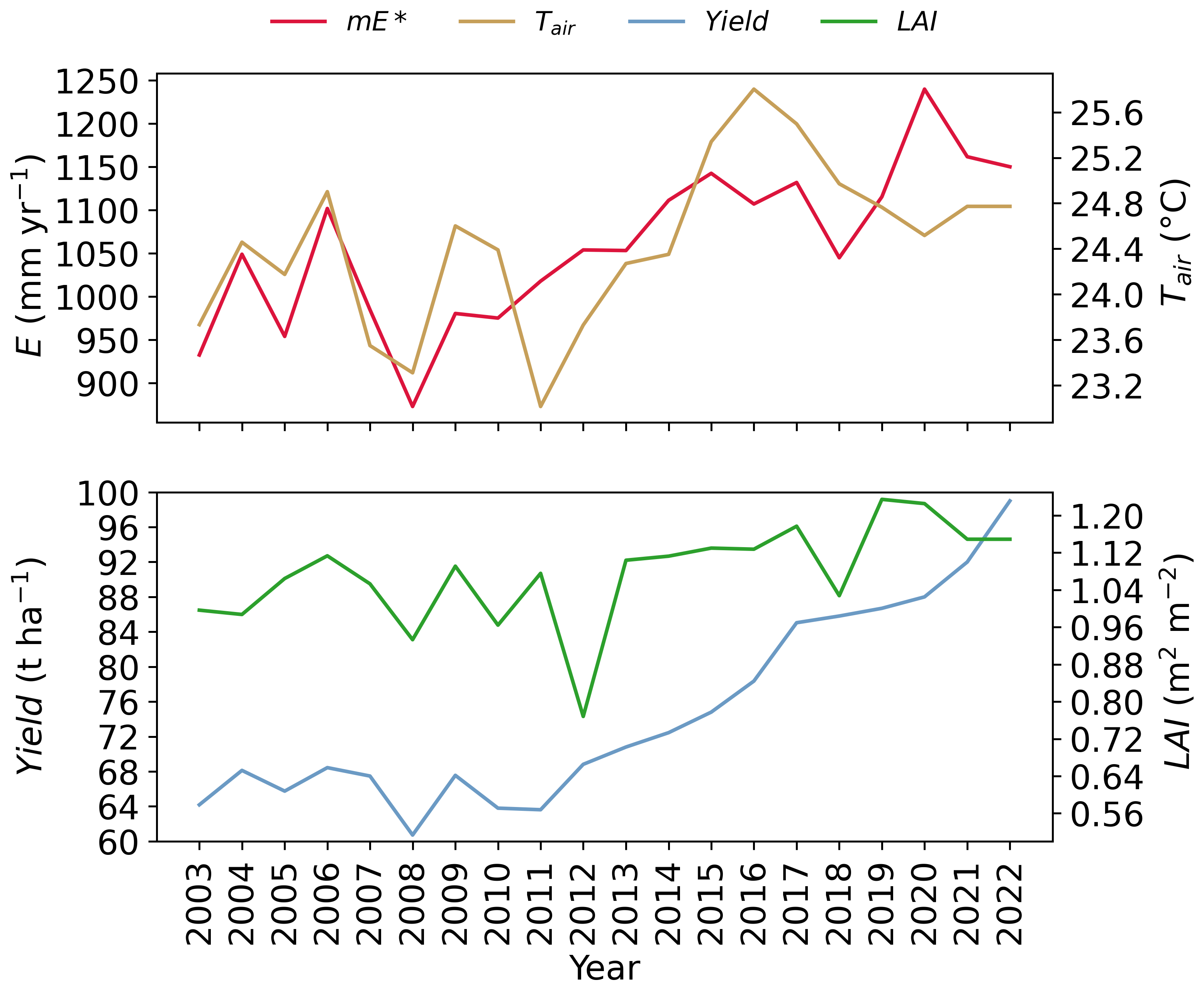 Finally, we note the interplay between all variables: water balance (P, E, C, and Q), weather, and crop variables. Despite relying on external water supplies, the basin has been experiencing a decreasing trend in the river discharge (Dwivedi and Yadav, 2025), coupled with increased evaporation from 2010 to 2022 (see the annual timeseries of the posterior mean in Fig. C2). The increase in posterior mean evaporation mirrors the increasing trend in the sugarcane yield and the leaf area index from 2011 (Fig. C4). This aligns with a period of increasing temperatures (see Fig. C4) and with the period when farmers started adopting new high-yielding sugarcane varieties in the basin, as reported by Indian Council of Agricultural Research (2022). The accelerating rate of evaporation in our estimates follows a similar trend in the Landsat-based SSEBop evaporation data set (Fig. C2). This shows, on the one hand, the usefulness of the water balance constraints in evaluating the data products, and on the other hand, that simplified ET models like SSEBop can sufficiently reproduce the evaporation dynamics.
