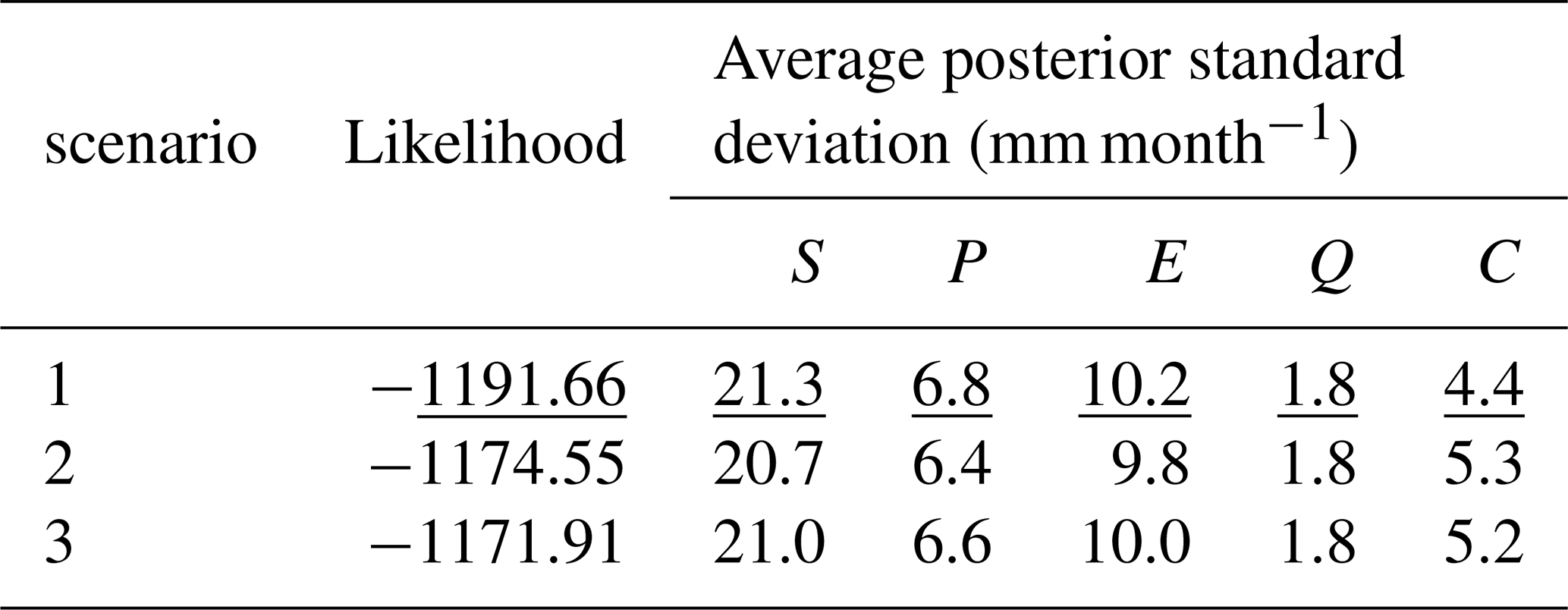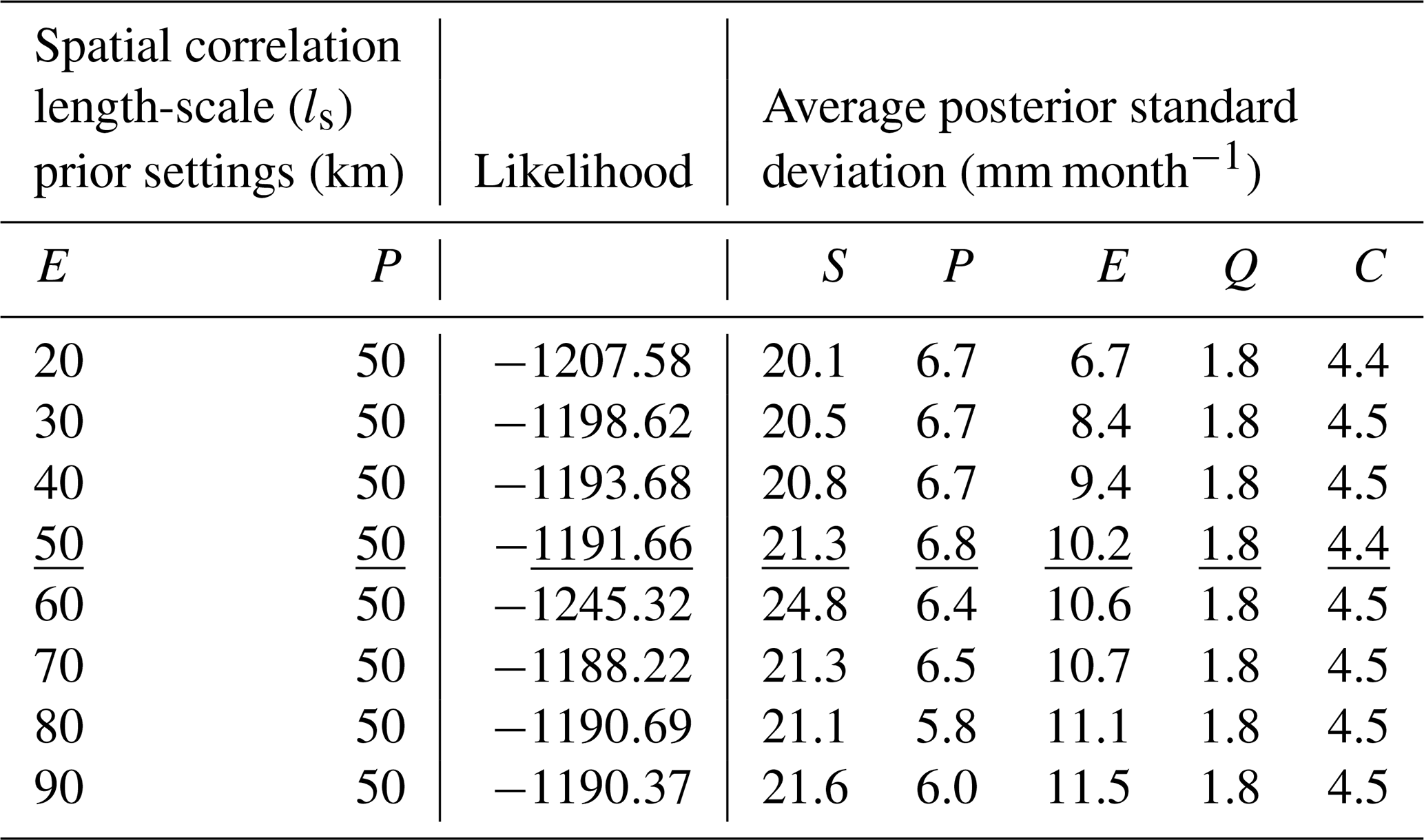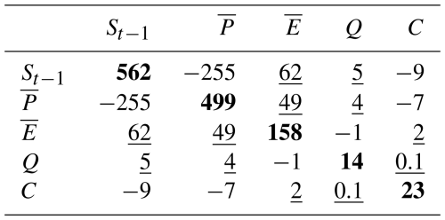 Table 2Basin-scale posterior covariance matrix of all water balance variables for July 2009, the diagonal elements represent the posterior variances (mm month−1) (shown in bold), while the off-diagonal entries represent the posterior covariances between the variables (mm2 month−2) (underlined values).