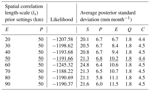 Here, we present the results of the two-step inference framework described in Sect. 4, starting with the basin-scale posteriors of all water balance variables (Sect. 5.1) and followed by the grid-scale posteriors of P and E (Sect. 5.2). These represent the baseline results that are based on specific choices of GRACE data (i.e., JPL mascon data) and spatial correlation lengths. The sensitivity of the results to these choices will be addressed in Sect. 6.
